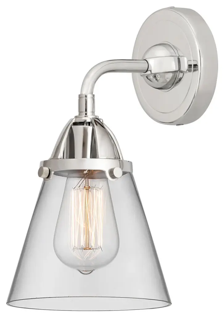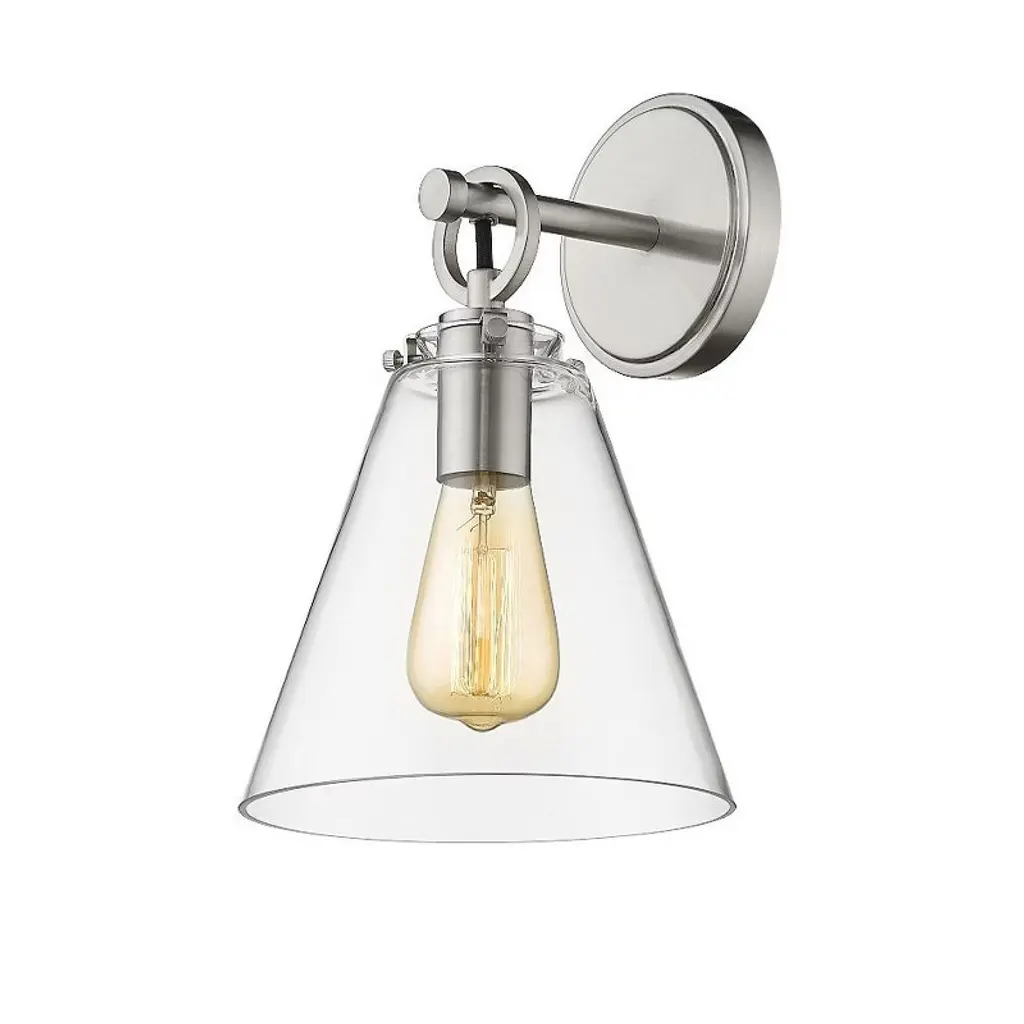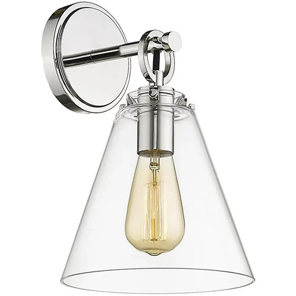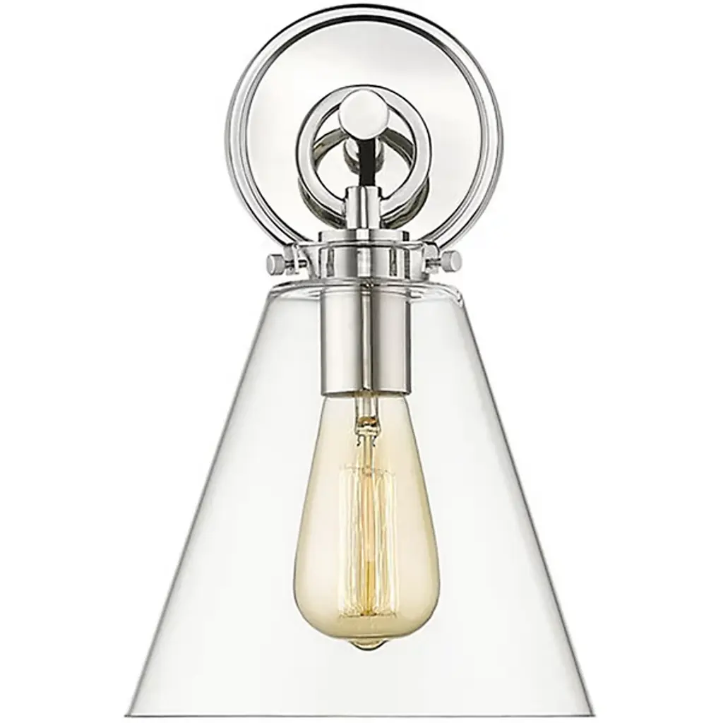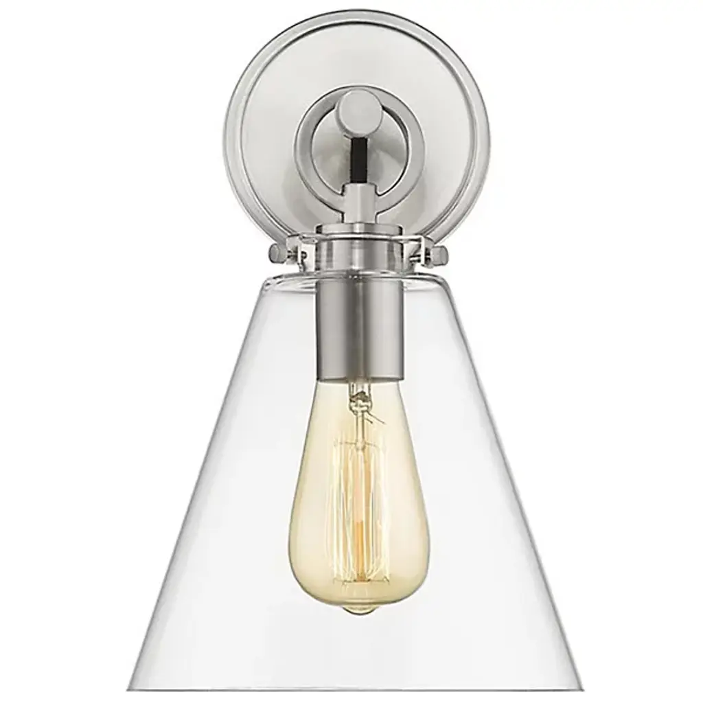 Elevate your contemporary bathroom with the Jameson Wall Sconce from Alder & Ore. This fixture boasts an elegant and delicate design, featuring a conical shade crafted from clear glass that adds a charming touch. The hand-tooled steel mount incorporates festive geometric accents in a brushed nickel finish. This sconce introduces a sense of dazzle and sophistication to your custom bath space, enhancing its style and ambiance with its chic design and warm, inviting illumination.