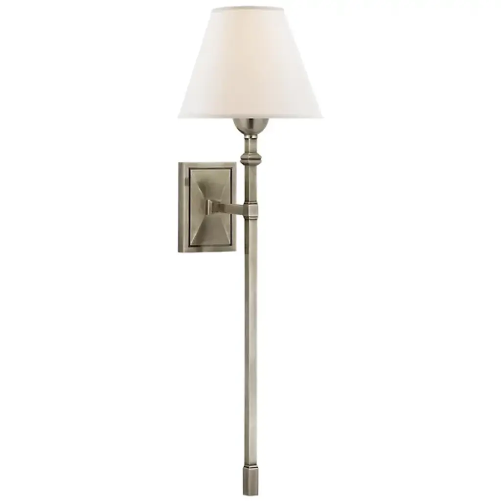 The Jane Tall Wall Sconce by Visual Comfort Signature, formerly known as Visual Comfort, is a sleek and tailored addition to spaces within your home. A simple silhouette defines this wall sconce as a long, slender arm is anchored to the wall with a rectangular backplate and highlighted with thoughtful geometric details that adorn the clean lines of this piece. Topped with a crisp, classically-styled, tapered, linen shade, this fixture lends an even and inviting layer of illumination to surroundings.