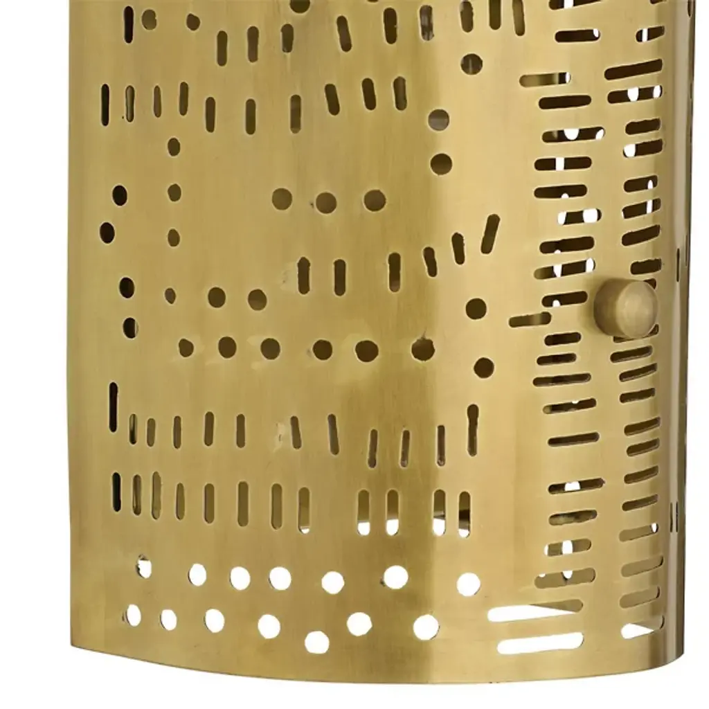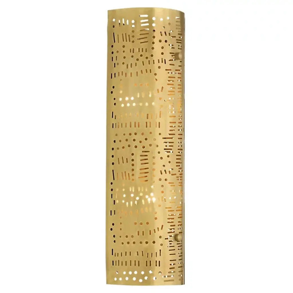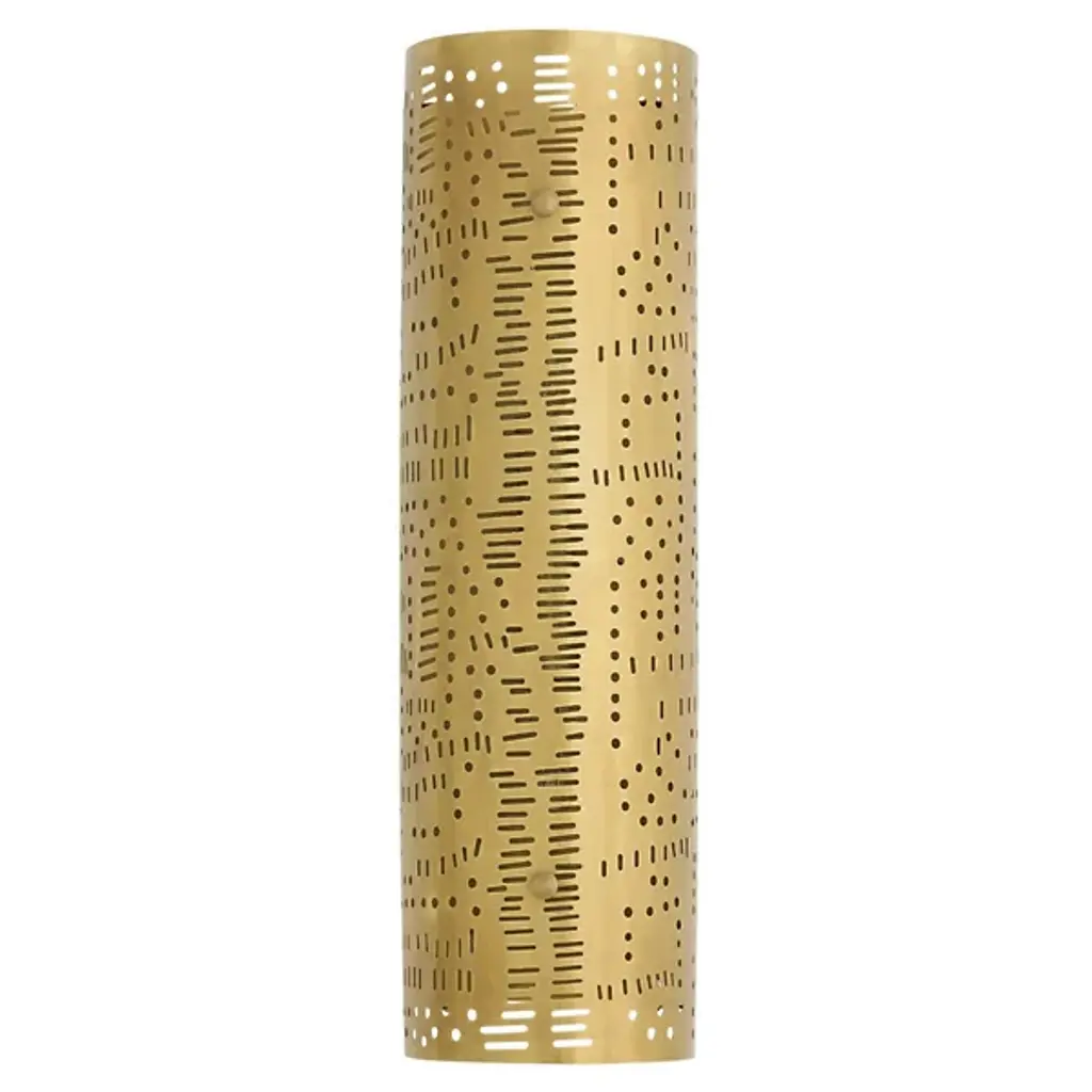 The Jarrett Wall Sconce from Arteriors interprets ancient craft through modern precision, with laser-cut antique brass forming a cylindrical vessel marked by intricate perforations. Each opening follows patterns inspired by traditional pottery, creating rhythmic clusters of dots and lines across the brass surface. The dual-bulb configuration illuminates from within, projecting the perforated design onto nearby walls. This piece bridges historical craftsmanship with contemporary manufacturing, where traditional motifs gain new life through precise metalwork.