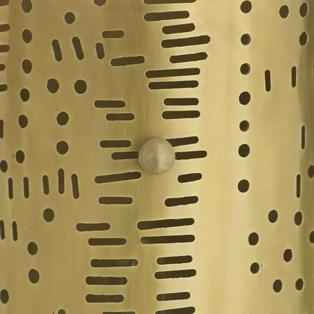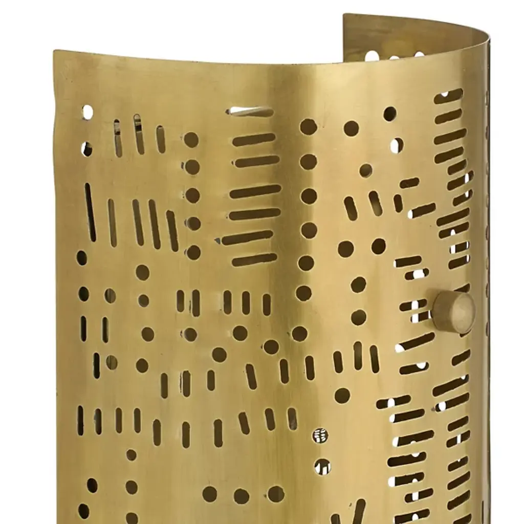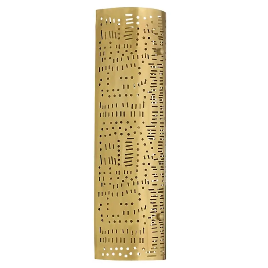 The Jarrett Wall Sconce from Arteriors interprets ancient craft through modern precision, with laser-cut antique brass forming a cylindrical vessel marked by intricate perforations. Each opening follows patterns inspired by traditional pottery, creating rhythmic clusters of dots and lines across the brass surface. The dual-bulb configuration illuminates from within, projecting the perforated design onto nearby walls. This piece bridges historical craftsmanship with contemporary manufacturing, where traditional motifs gain new life through precise metalwork.
