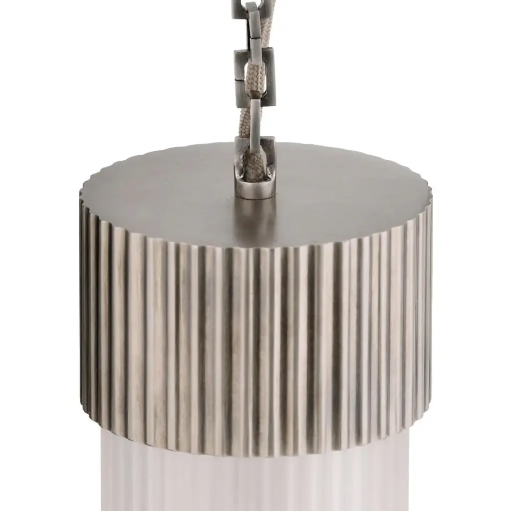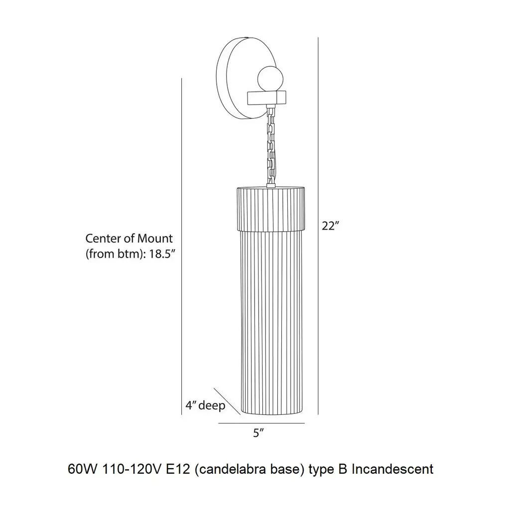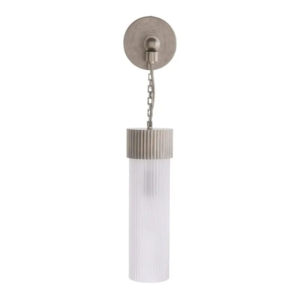 The Jayce Wall Sconce from Arteriors is lighting as sculpture—refined, dimensional, and quietly dramatic. Inspired by the suspended elegance of pendant lighting, this wall fixture reinterprets the concept with a bold vertical drop and chain-link detail that feels both architectural and unexpected. At its center, a ribbed frosted glass shade glows softly, framed by a “chattered” metal accent—either in antique brass or vintage silver—that adds texture, tension, and tactile beauty. Highlights