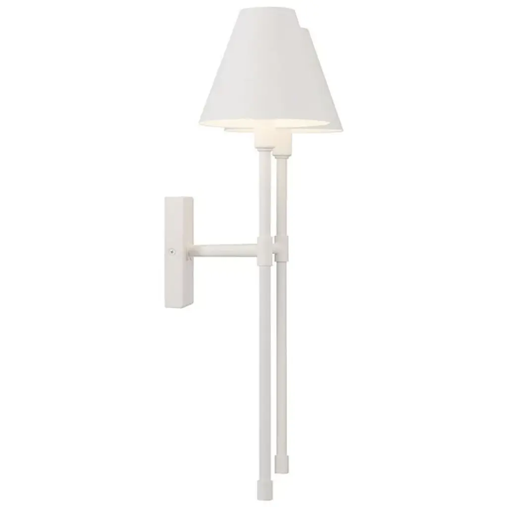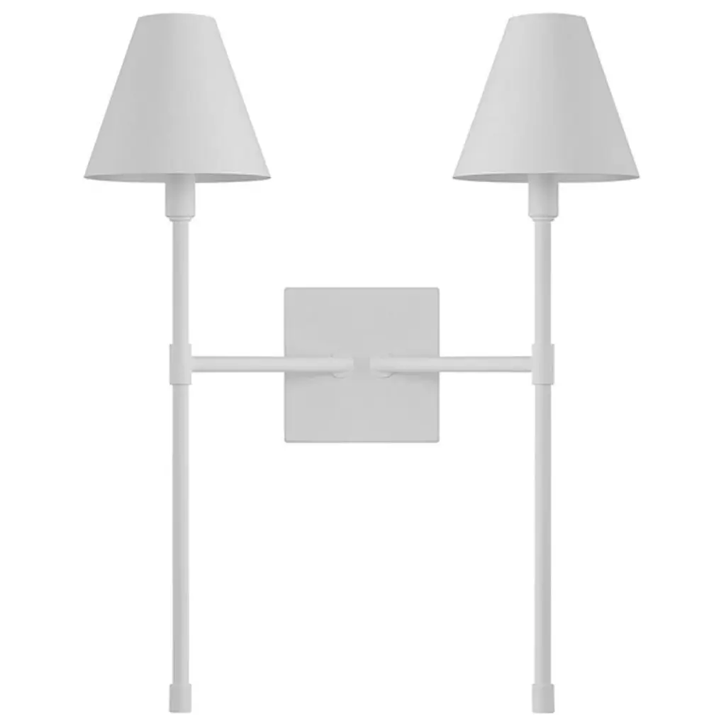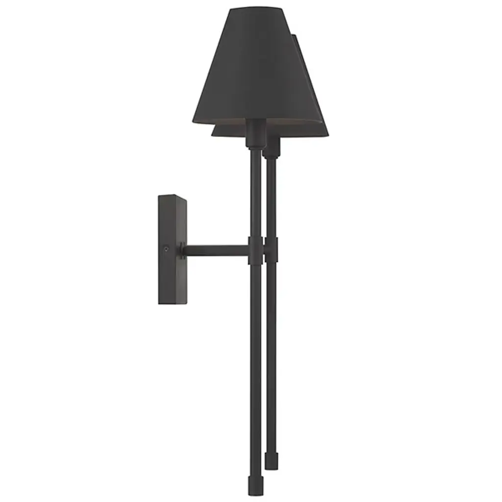 Fuse vintage, traditional, and modern elements seamlessly with the Jefferson 2-Light Wall Sconce from Savoy House. Its elongated, sleek body boasts a memorable silhouette, while matching conical metal shades on either side offer a refined blend of classic and contemporary aesthetics. Emitting a subtle, indirect illumination, the sconce creates a warm and inviting ambiance. The slender stems on each side add an extra touch of grace to the design. Enhanced by a sleek metal surface, the sconce becomes a captivating centerpiece, casting a soft, reflected radiance.