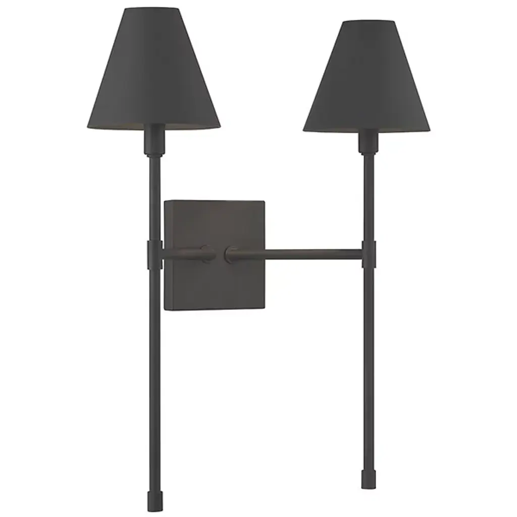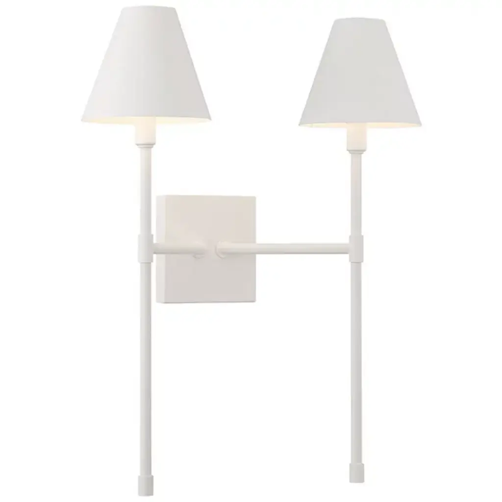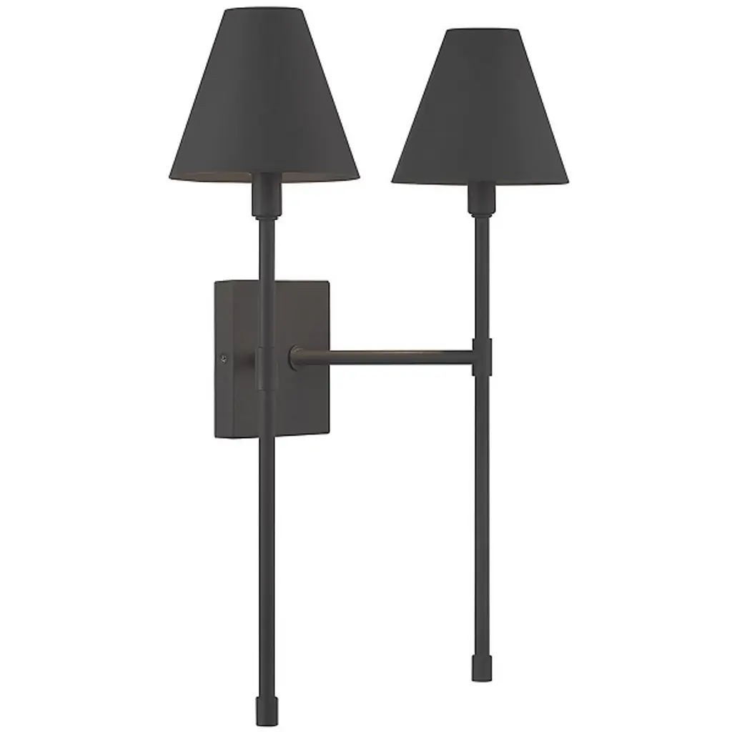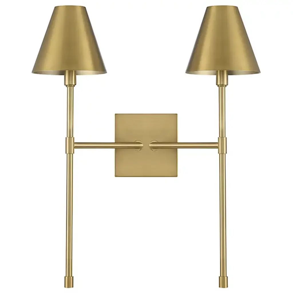 Fuse vintage, traditional, and modern elements seamlessly with the Jefferson 2-Light Wall Sconce from Savoy House. Its elongated, sleek body boasts a memorable silhouette, while matching conical metal shades on either side offer a refined blend of classic and contemporary aesthetics. Emitting a subtle, indirect illumination, the sconce creates a warm and inviting ambiance. The slender stems on each side add an extra touch of grace to the design. Enhanced by a sleek metal surface, the sconce becomes a captivating centerpiece, casting a soft, reflected radiance.