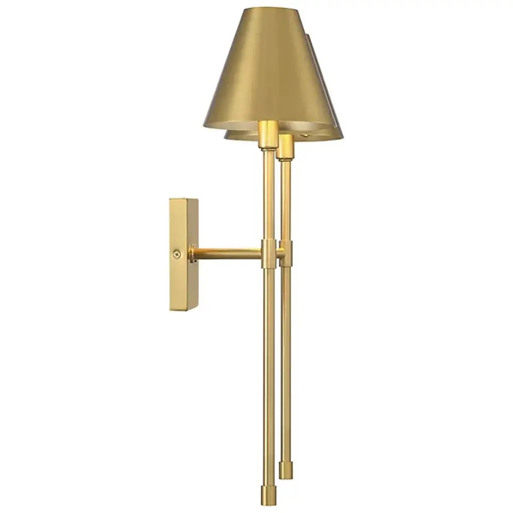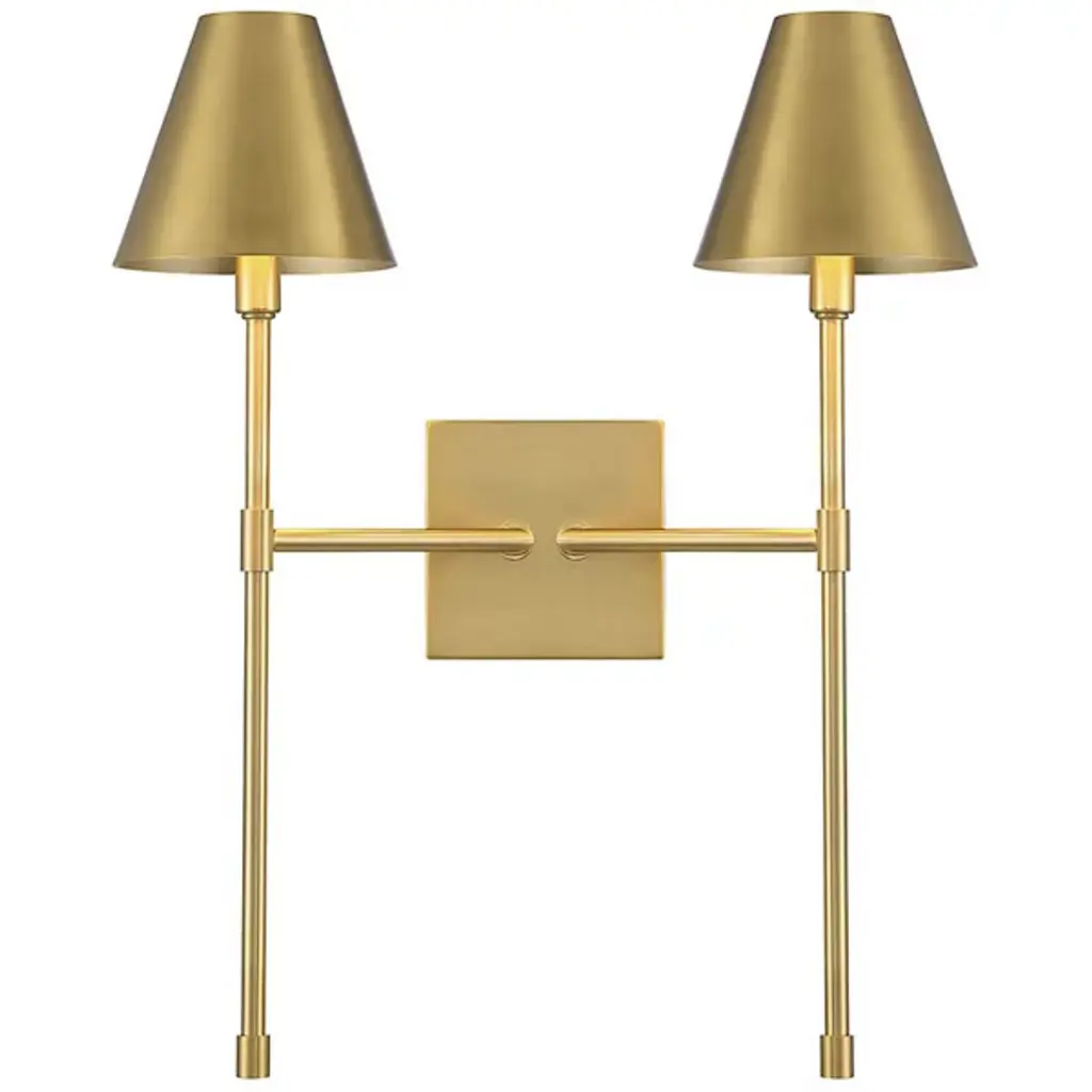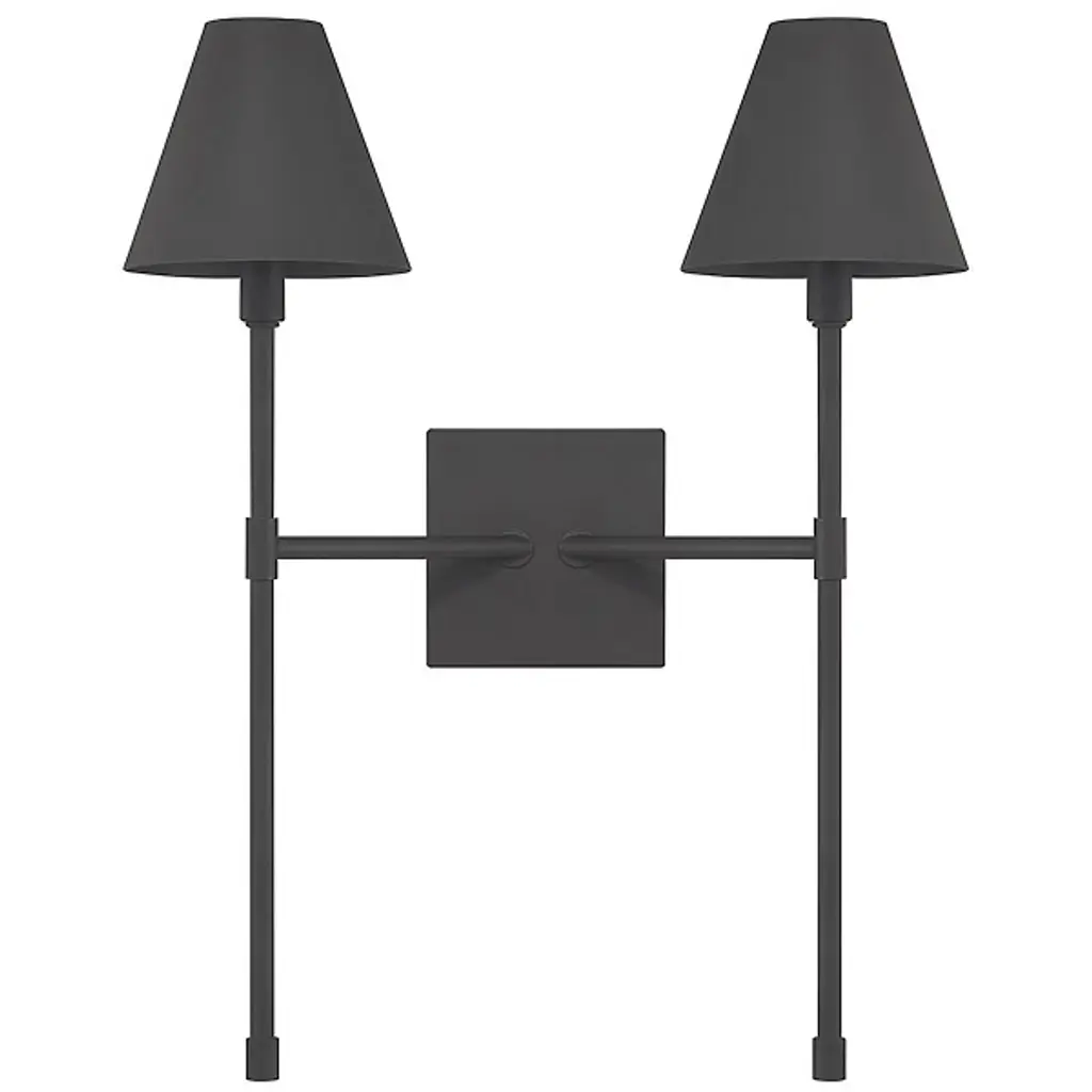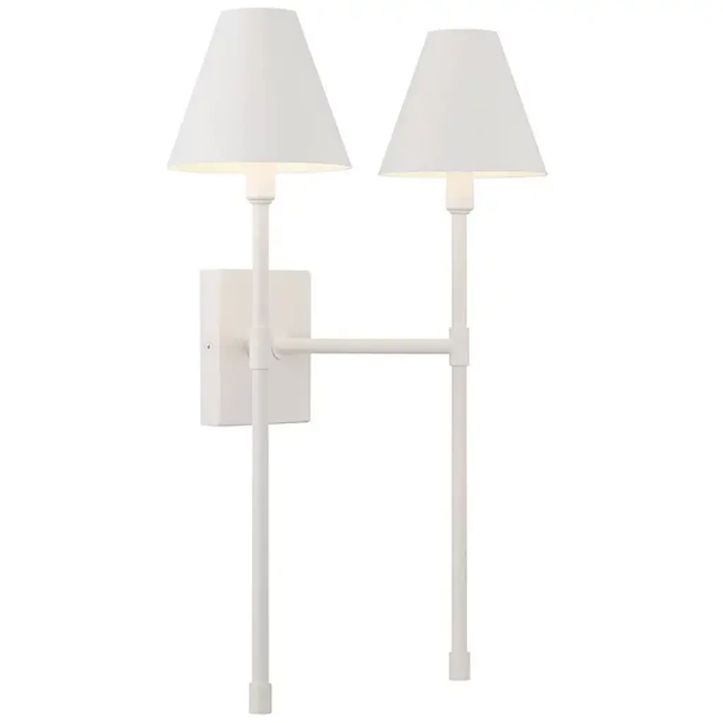 Fuse vintage, traditional, and modern elements seamlessly with the Jefferson 2-Light Wall Sconce from Savoy House. Its elongated, sleek body boasts a memorable silhouette, while matching conical metal shades on either side offer a refined blend of classic and contemporary aesthetics. Emitting a subtle, indirect illumination, the sconce creates a warm and inviting ambiance. The slender stems on each side add an extra touch of grace to the design. Enhanced by a sleek metal surface, the sconce becomes a captivating centerpiece, casting a soft, reflected radiance.