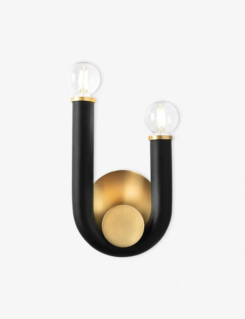 A whimsical take on modern style, this chic wall sconce features a sleek black pipe draped over brass hardware. Playing with shapes and textures, it's finished with two spherical bulbs.