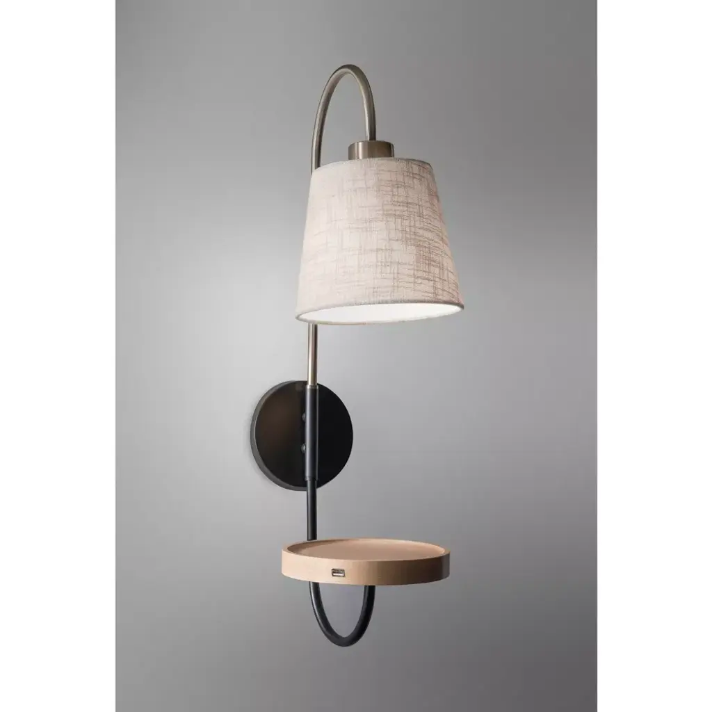 A wall lamp that can provide lighting, storage and a charging station all in one can be found in the Jeffrey collection. An antique brass finish with black accents and a beautiful textured off-white fabric shade make the Jeffrey Wall Lamp not only extremely functional, but stylish as well. A 7" natural wood round shelf has a catch-all rim for efficient storage and 1 USB port to charge your smart devices. This lamp can either be hardwired or used as a portable plug-in wall lamp with a decorative black fabric covered cord. A rotary switch located above the socket turns the lamp on and off. This lamp is smart outlet compatible. Bulb is not included.