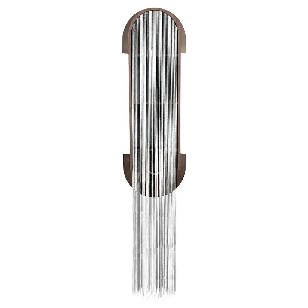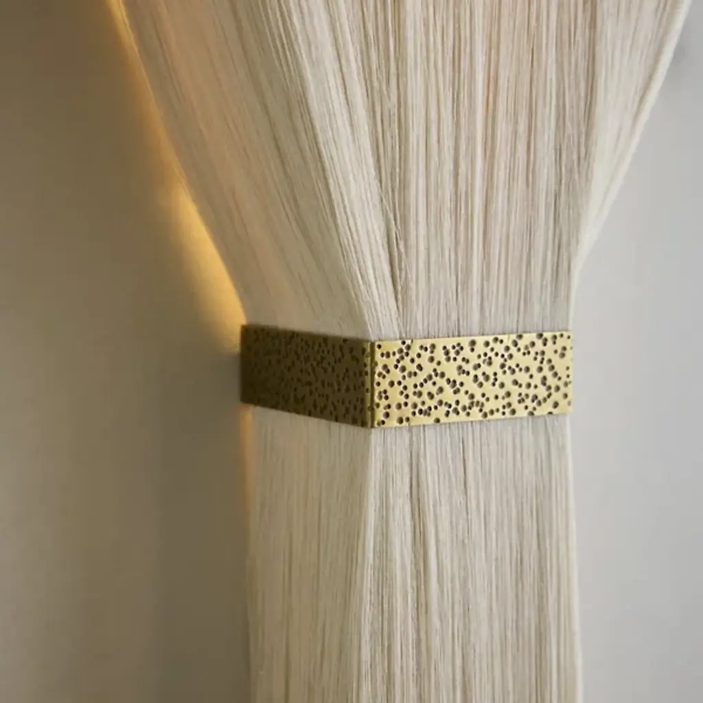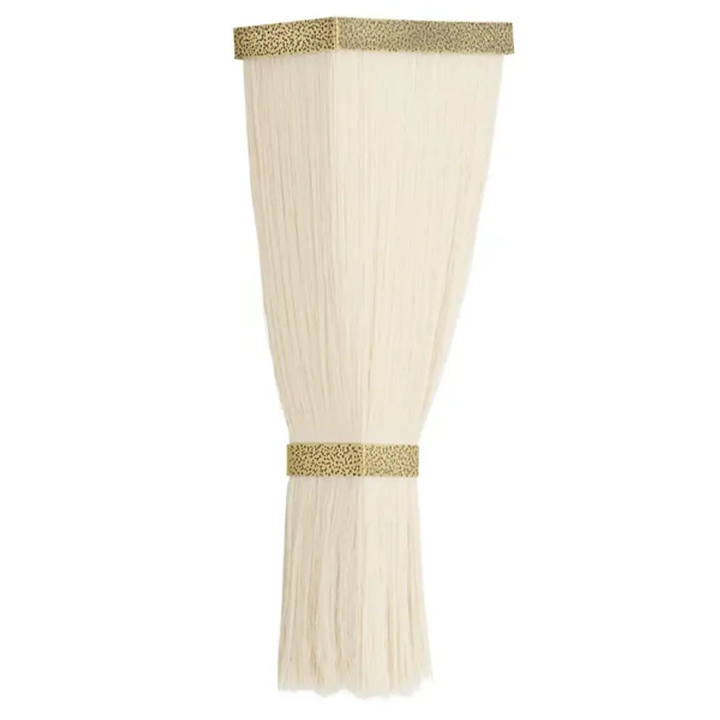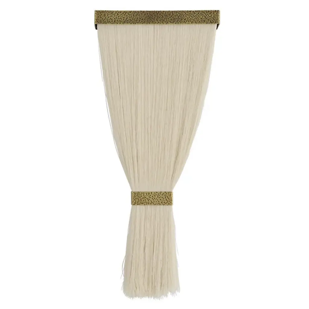 The Jenessa LED Wall Sconce from Arteriors features a luxurious tassel of ivory microfiber, contained within textured metal framing, which creates a jewelry-like refinement through the contrast of materials. Warm LED light projects upward, while chattered antique brass detailing cinches the microfiber bundle. The soft textile meets hard metal in sophisticated harmony, with the tassel element adding movement and tactile richness. This wall fixture enhances spaces through both illumination and decorative presence, with the microfiber strands creating gentle texture against the precise metal framework.