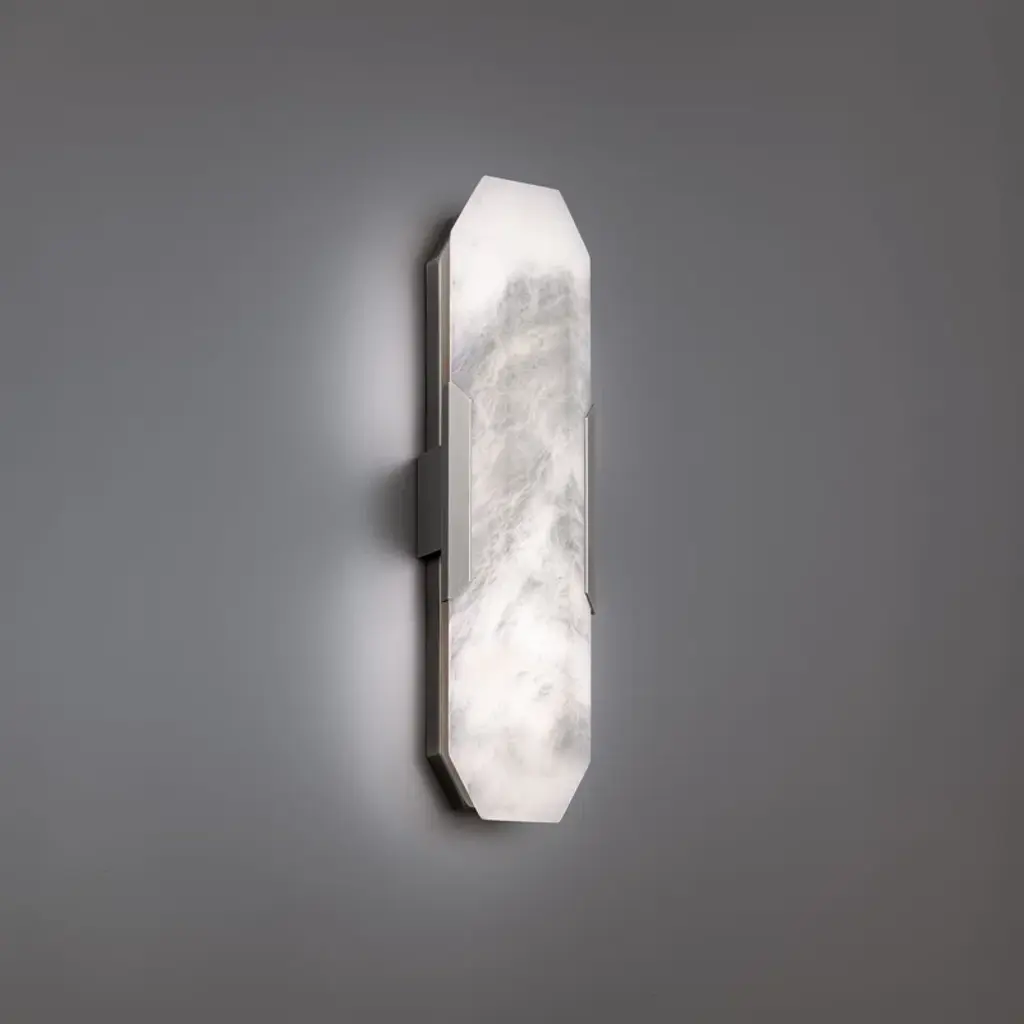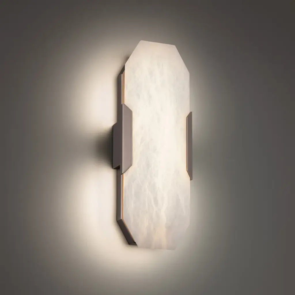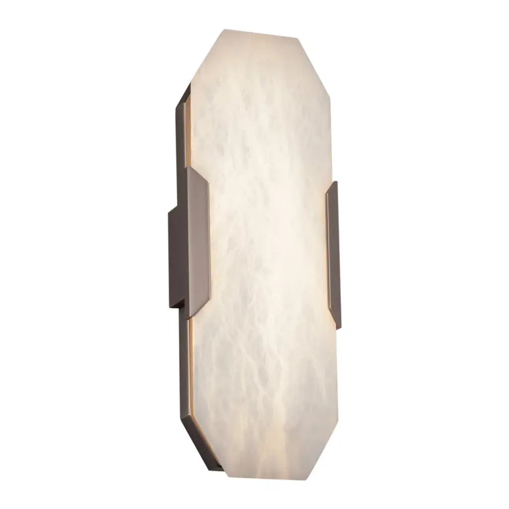 Add a dose of luxury from the rich and varied look of carved alabaster. Simply held by two metal accents. Diffused illumination glows from the stone creating an elegant, refined aesthetic.