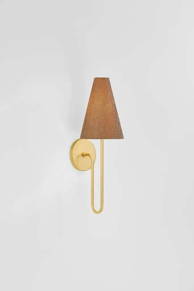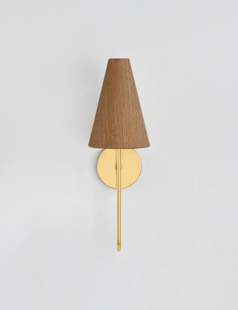 Merging design motifs and materiality from different eras, Jessel brings an antique style into the modern day. The sweeping Aged Brass arms recall vintage chandeliers, while the elongated grasscloth shades lend a casual tone that is grounded in the present. Available as a 1-light sconce or 5-light chandelier, Jessel is particularly well-suited to cottage-style interiors.*Due to the one-of-a-kind nature of the medium, exact colors and patterns may vary slightly from the image shown.