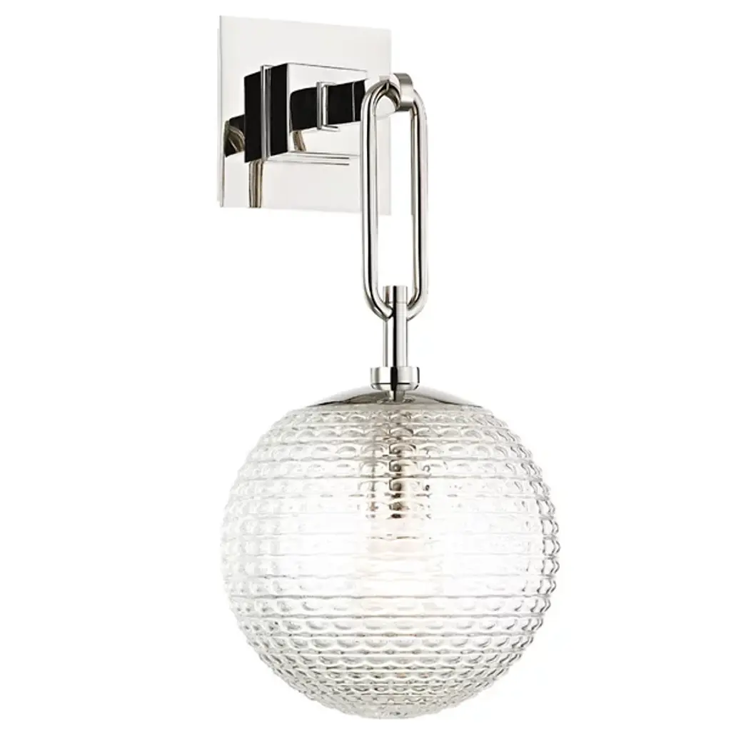 Jewelry for your walls. The Jewett Wall Sconce by Hudson Valley Lighting brings modern good looks and plenty of sparkle to your indoor spaces. Resembling a necklace pendant, the single bulb emits warmly diffused light from inside the Clear Glass shade. Suspended by a large oval hook tucked into the curved arm, the light brings style, sophistication and an extra layer of light to a foyer, bedroom, dining room or living room.