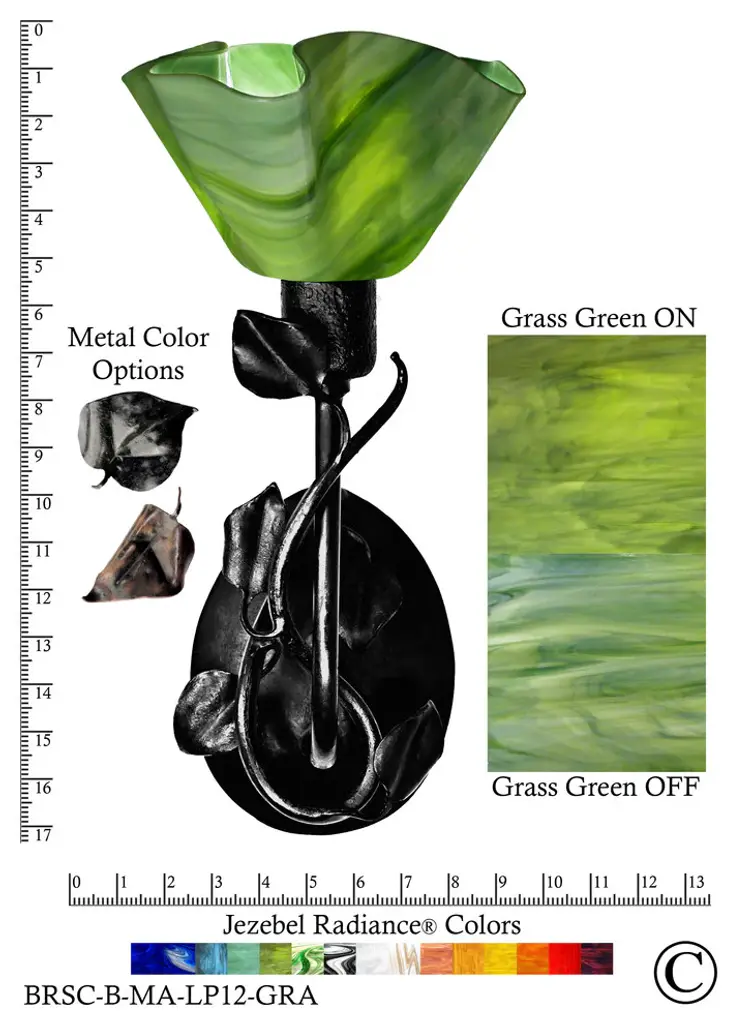 Our glass is handmade in the USA using a process patented to Jezebel. This entirely handmade light measures 17"H x 8.5"W x 8.5"D. The hand-forged iron base is wired for 120 volts. This light can be used with a medium base bulb (not included): Incandescent, Fluorescent or LED. The Jezebel Radiance line of glass is premium, heirloom quality glass. Jezebel Radiance glass has streaks of bold, brilliantly intense color with a shiny surface. Glass shades are shaped using a process patented to Jezebel. This is a stunningly beautiful hand rolled sheet glass. There is no unsightly hot spot from a light bulb. Meanwhile, pure color and light will flood your space with ambiance. Jezebel Radiance Branch Sconces are made in the USA of handcrafted glass using a process patented to Jezebel. The remarkably saturated hues can be ordered in a variety of glass colors. All Jezebel Radiance products are UL certified and 120 Volts. This light can be used with a medium base bulb (not included): Incandescent, Fluorescent or LED. Naturally occurring air bubbles, inclusions, textures and slight color variations demonstrate that your Jezebel Radiance Branch Sconce is an original work of art. Your Jezebel Radiance Branch Sconce is made of hand-forged iron and comes with our 2-year limited warranty. If your hardware or glass shade arrives defective in any way, please contact your retailer for claim instructions. UL approved, dry, wet or damp or similar testing lab: UL compliant, for dry or damp areasHardwire or plug: HardwireType of bulbs needed: Medium BaseWattage: 60 watt Incandescent or equivalent LEDNumber of bulbs required? (Included? Y/N): 1 (N)
