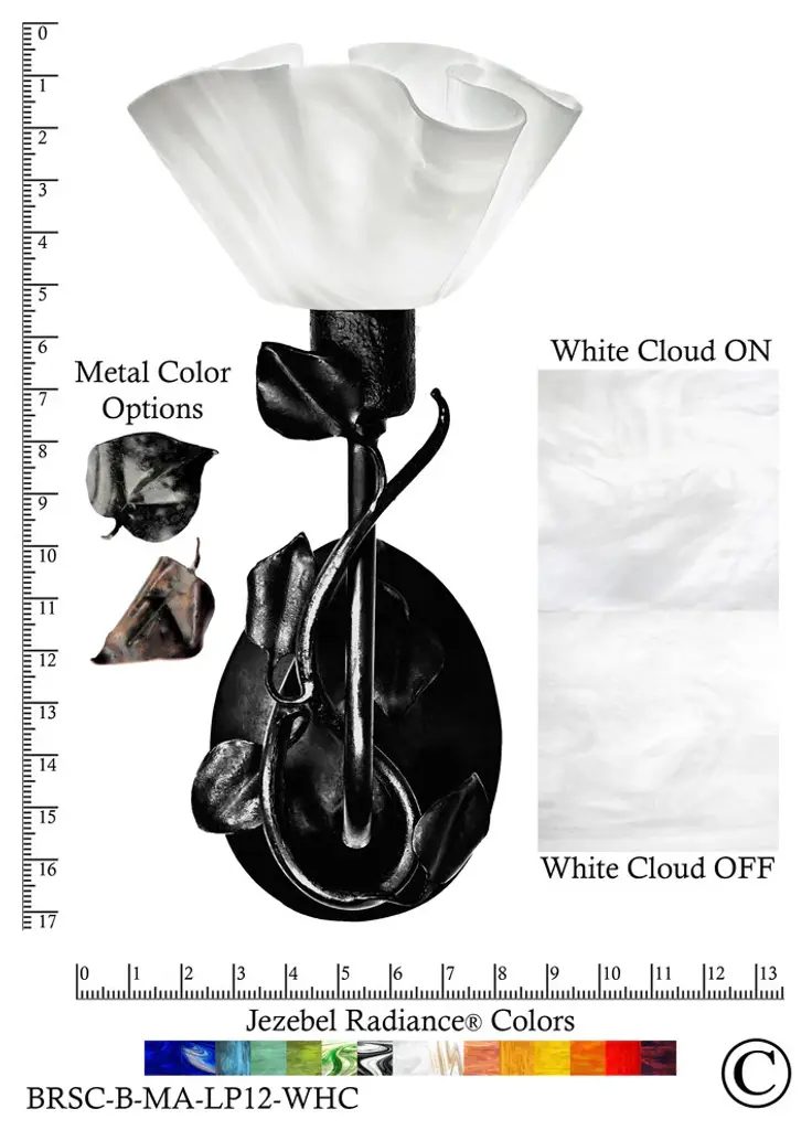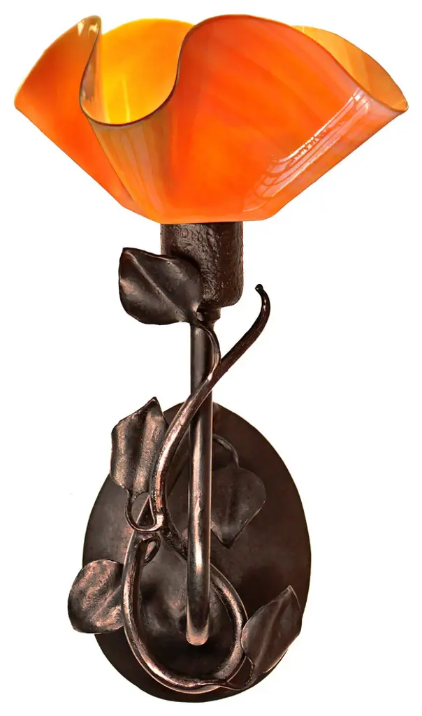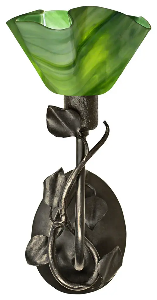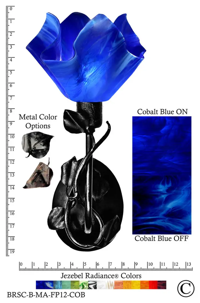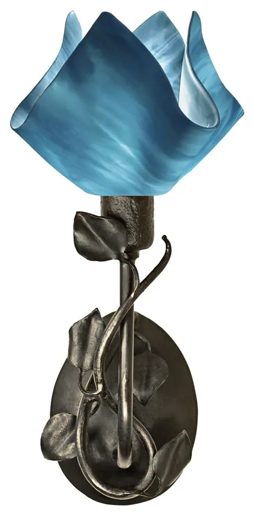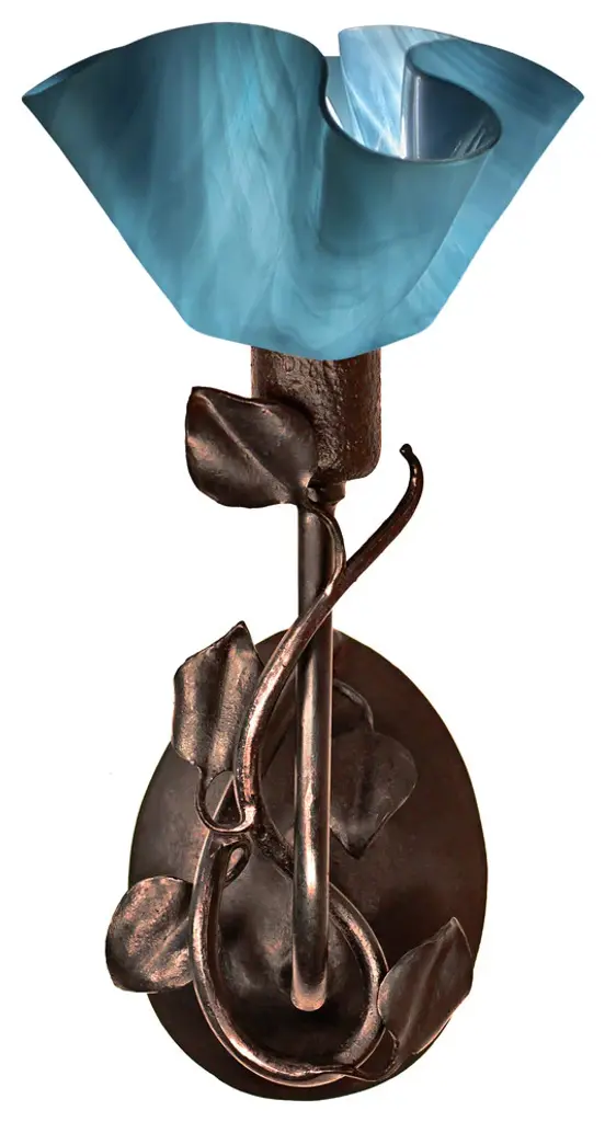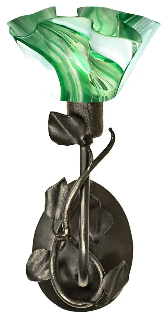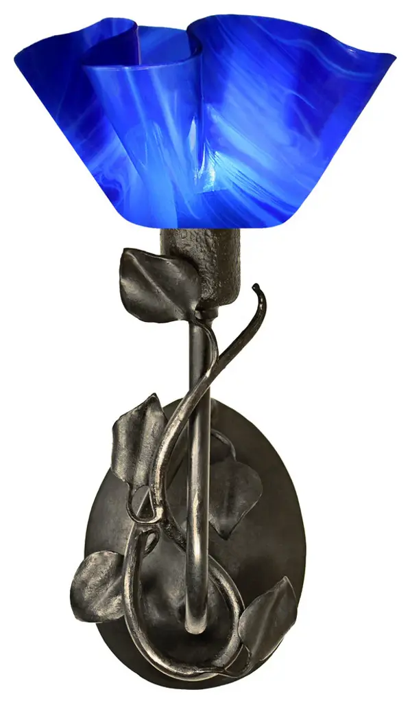 Our glass is handmade in the USA using a process patented to Jezebel. This entirely handmade light measures 19"H x 8.5"W x 8.5"D. The hand-forged iron base is wired for 120 volts. This light can be used with a medium base bulb (not included): Incandescent, Fluorescent or LED. The Jezebel Radiance line of glass is premium, heirloom quality glass. Jezebel Radiance glass has streaks of bold, brilliantly intense color with a shiny surface. Glass shades are shaped using a process patented to Jezebel. This is a stunningly beautiful hand rolled sheet glass. There is no unsightly hot spot from a light bulb. Meanwhile, pure color and light will flood your space with ambiance. Jezebel Radiance Branch Sconces are made in the USA of handcrafted glass using a process patented to Jezebel. The remarkably saturated hues can be ordered in a variety of glass colors. All Jezebel Radiance products are UL certified and 120 Volts. This light can be used with a medium base bulb (not included): Incandescent, Fluorescent or LED. Naturally occurring air bubbles, inclusions, textures and slight color variations demonstrate that your Jezebel Radiance Branch Sconce is an original work of art. Your Jezebel Radiance Branch Sconce is made of hand-forged iron and comes with our 2-year limited warranty. If your hardware or glass shade arrives defective in any way, please contact your retailer for claim instructions. UL approved, dry, wet or damp or similar testing lab: UL compliant, for dry or damp areasHardwire or plug: HardwireType of bulbs needed: Medium BaseWattage: 60 watt Incandescent or equivalent LEDNumber of bulbs required? 1Included? Y/N: N