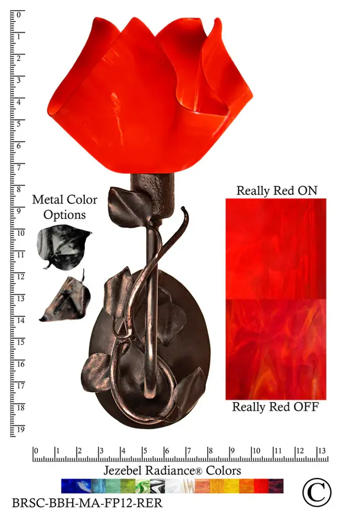 Our glass is handmade in the USA using a process patented to Jezebel. This entirely handmade light measures 19"H x 8.5"W x 8.5"D. The hand-forged iron base is wired for 120 volts. This light can be used with a medium base bulb (not included): Incandescent, Fluorescent or LED. The Jezebel Radiance line of glass is premium, heirloom quality glass. Jezebel Radiance glass has streaks of bold, brilliantly intense color with a shiny surface. Glass shades are shaped using a process patented to Jezebel. This is a stunningly beautiful hand rolled sheet glass. There is no unsightly hot spot from a light bulb. Meanwhile, pure color and light will flood your space with ambiance. Jezebel Radiance Branch Sconces are made in the USA of handcrafted glass using a process patented to Jezebel. The remarkably saturated hues can be ordered in a variety of glass colors. All Jezebel Radiance products are UL certified and 120 Volts. This light can be used with a medium base bulb (not included): Incandescent, Fluorescent or LED. Naturally occurring air bubbles, inclusions, textures and slight color variations demonstrate that your Jezebel Radiance Branch Sconce is an original work of art. Your Jezebel Radiance Branch Sconce is made of hand-forged iron and comes with our 2-year limited warranty. If your hardware or glass shade arrives defective in any way, please contact your retailer for claim instructions. UL approved, dry, wet or damp or similar testing lab: UL compliant, for dry or damp areasHardwire or plug: HardwireType of bulbs needed: Medium BaseWattage: 60 watt Incandescent or equivalent LEDNumber of bulbs required? (Included? Y/N): 1 (N)