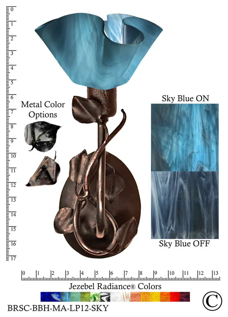 Our glass is handmade in the USA using a process patented to Jezebel. This entirely handmade light measures 17"H x 8.5"W x 8.5"D. The hand-forged iron base is wired for 120 volts. This light can be used with a medium base bulb (not included): Incandescent, Fluorescent or LED. The Jezebel Radiance line of glass is premium, heirloom quality glass. Jezebel Radiance glass has streaks of bold, brilliantly intense color with a shiny surface. Glass shades are shaped using a process patented to Jezebel. This is a stunningly beautiful hand rolled sheet glass. There is no unsightly hot spot from a light bulb. Meanwhile, pure color and light will flood your space with ambiance. Jezebel Radiance Branch Sconces are made in the USA of handcrafted glass using a process patented to Jezebel. The remarkably saturated hues can be ordered in a variety of glass colors. All Jezebel Radiance products are UL certified and 120 Volts. This light can be used with a medium base bulb (not included): Incandescent, Fluorescent or LED. Naturally occurring air bubbles, inclusions, textures and slight color variations demonstrate that your Jezebel Radiance Branch Sconce is an original work of art. Your Jezebel Radiance Branch Sconce is made of hand-forged iron and comes with our 2-year limited warranty. If your hardware or glass shade arrives defective in any way, please contact your retailer for claim instructions. UL approved, dry, wet or damp or similar testing lab: UL compliant, for dry or damp areasHardwire or plug: HardwireType of bulbs needed: Medium BaseWattage: 60 watt Incandescent or equivalent LEDNumber of bulbs required? (Included? Y/N): 1 (N)