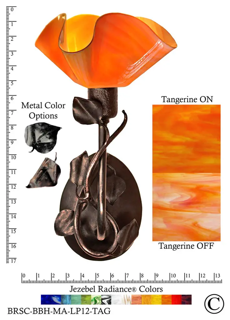 Our glass is handmade in the USA using a process patented to Jezebel. This entirely handmade light measures 17"H x 8.5"W x 8.5"D. The hand-forged iron base is wired for 120 volts. This light can be used with a medium base bulb (not included): Incandescent, Fluorescent or LED. The Jezebel Radiance line of glass is premium, heirloom quality glass. Jezebel Radiance glass has streaks of bold, brilliantly intense color with a shiny surface. Glass shades are shaped using a process patented to Jezebel. This is a stunningly beautiful hand rolled sheet glass. There is no unsightly hot spot from a light bulb. Meanwhile, pure color and light will flood your space with ambiance. Jezebel Radiance Branch Sconces are made in the USA of handcrafted glass using a process patented to Jezebel. The remarkably saturated hues can be ordered in a variety of glass colors. All Jezebel Radiance products are UL certified and 120 Volts. This light can be used with a medium base bulb (not included): Incandescent, Fluorescent or LED. Naturally occurring air bubbles, inclusions, textures and slight color variations demonstrate that your Jezebel Radiance Branch Sconce is an original work of art. Your Jezebel Radiance Branch Sconce is made of hand-forged iron and comes with our 2-year limited warranty. If your hardware or glass shade arrives defective in any way, please contact your retailer for claim instructions. UL approved, dry, wet or damp or similar testing lab: UL compliant, for dry or damp areasHardwire or plug: HardwireType of bulbs needed: Medium BaseWattage: 60 watt Incandescent or equivalent LEDNumber of bulbs required? (Included? Y/N): 1 (N)