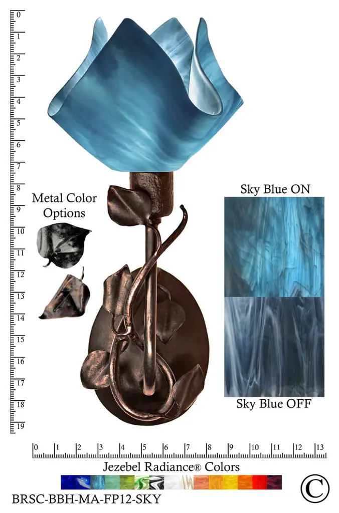 Our glass is handmade in the USA using a process patented to Jezebel. This entirely handmade light measures 19"H x 8.5"W x 8.5"D. The hand-forged iron base is wired for 120 volts. This light can be used with a medium base bulb (not included): Incandescent, Fluorescent or LED. The Jezebel Radiance line of glass is premium, heirloom quality glass. Jezebel Radiance glass has streaks of bold, brilliantly intense color with a shiny surface. Glass shades are shaped using a process patented to Jezebel. This is a stunningly beautiful hand rolled sheet glass. There is no unsightly hot spot from a light bulb. Meanwhile, pure color and light will flood your space with ambiance. Jezebel Radiance Branch Sconces are made in the USA of handcrafted glass using a process patented to Jezebel. The remarkably saturated hues can be ordered in a variety of glass colors. All Jezebel Radiance products are UL certified and 120 Volts. This light can be used with a medium base bulb (not included): Incandescent, Fluorescent or LED. Naturally occurring air bubbles, inclusions, textures and slight color variations demonstrate that your Jezebel Radiance Branch Sconce is an original work of art. Your Jezebel Radiance Branch Sconce is made of hand-forged iron and comes with our 2-year limited warranty. If your hardware or glass shade arrives defective in any way, please contact your retailer for claim instructions. UL approved, dry, wet or damp or similar testing lab: UL compliant, for dry or damp areasHardwire or plug: HardwireType of bulbs needed: Medium BaseWattage: 60 watt Incandescent or equivalent LEDNumber of bulbs required? (Included? Y/N): 1 (N)