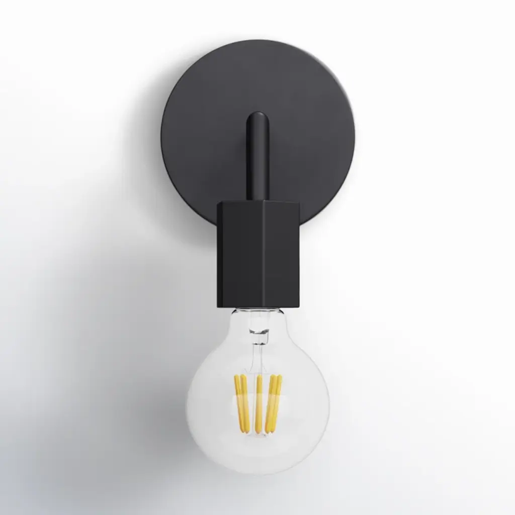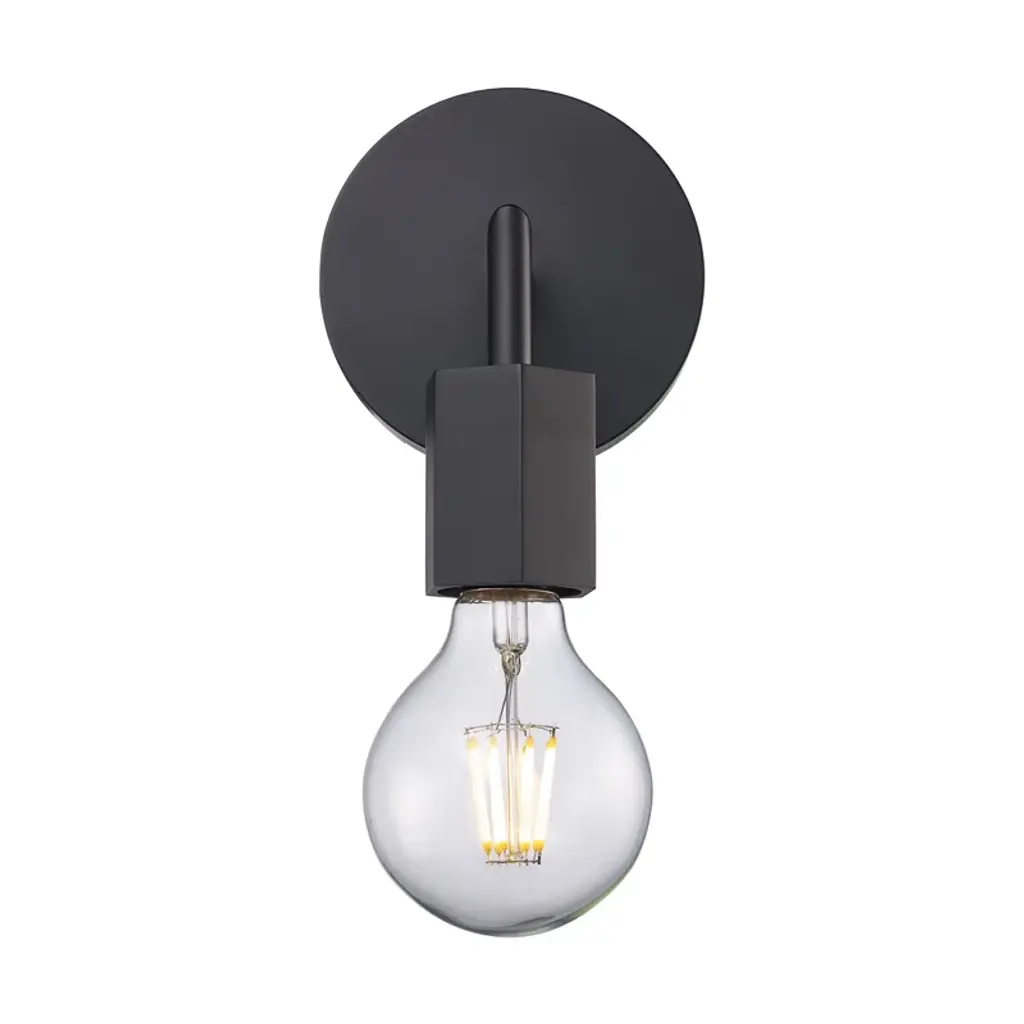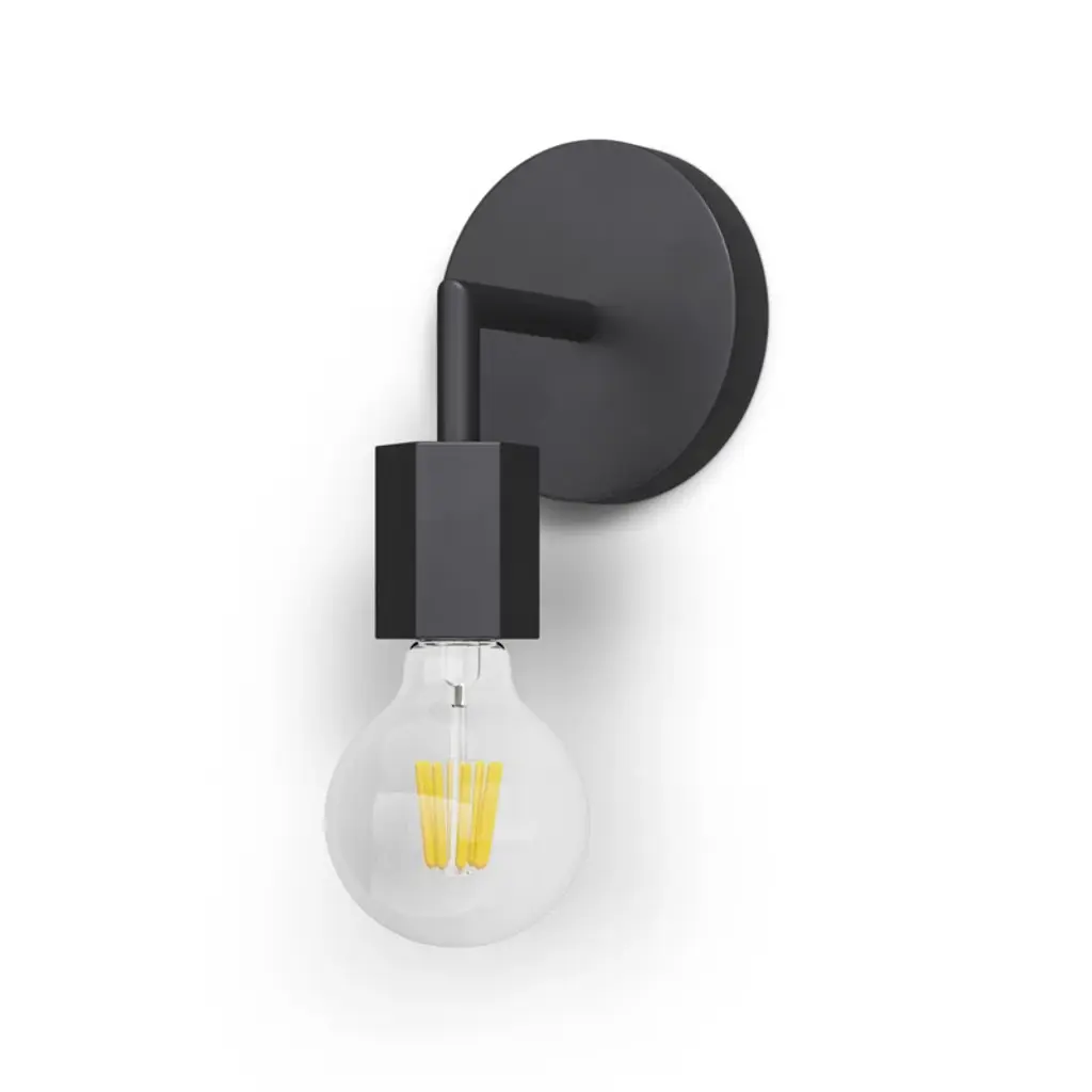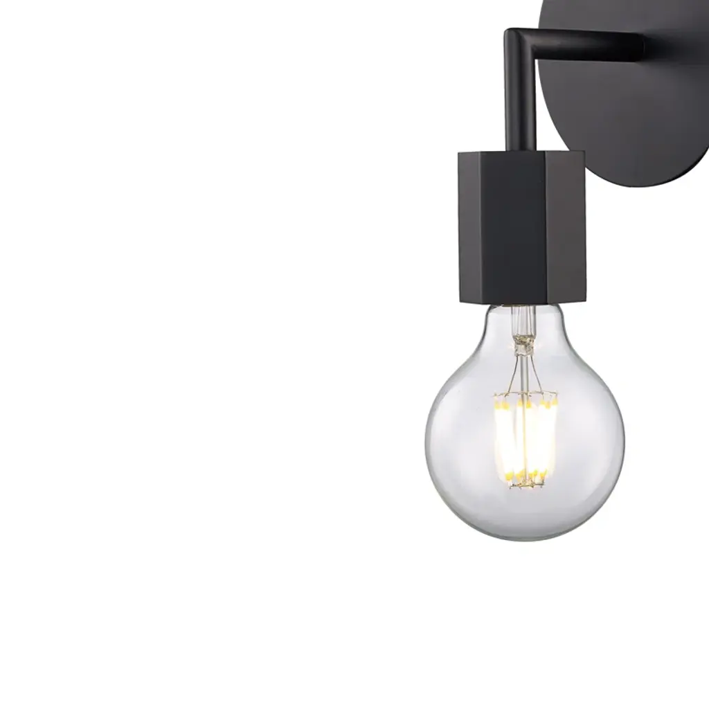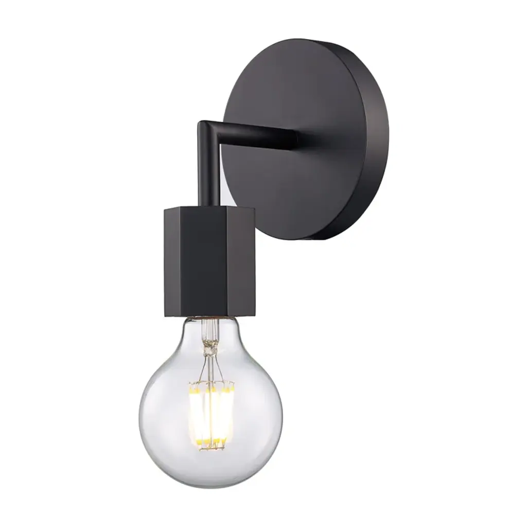 "Light it up!" This dimmable armed sconce brings an industrial flair to any room in your home. Built from quality wrought iron, the circular backplate and sturdy arm showcase a unique hexagonal socket. The exposed bulb design is a true nod to edgy appeal while maintaining a warm, inviting glow. Plus, you can install it in damp areas, perfect for those steamy bathrooms. So why not brighten your space with this versatile lighting solution? Just remember, the bulb's not included.