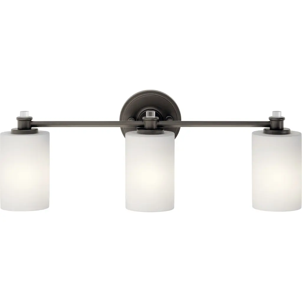 Joelson delivers a 3-light vanity that's transitional and versatile. This fixture showcases retro-inspired light bulb sockets with beautiful satin etched cased opal glass. For added ambiance, Joelson is appointed with an Olde Bronze(R) finish.