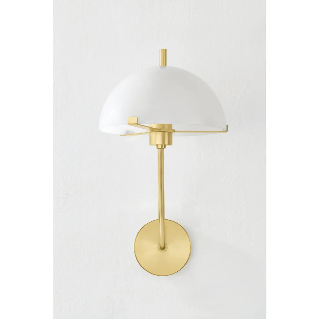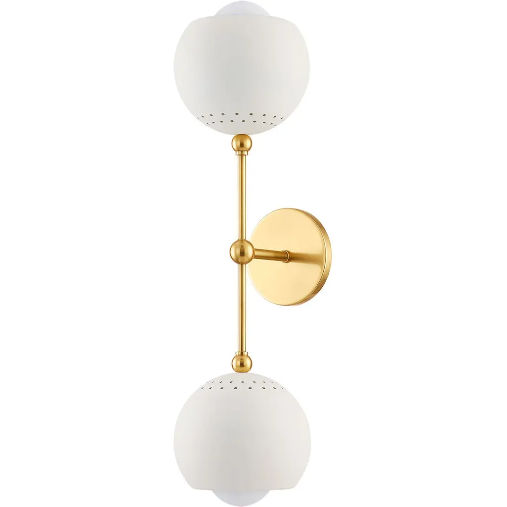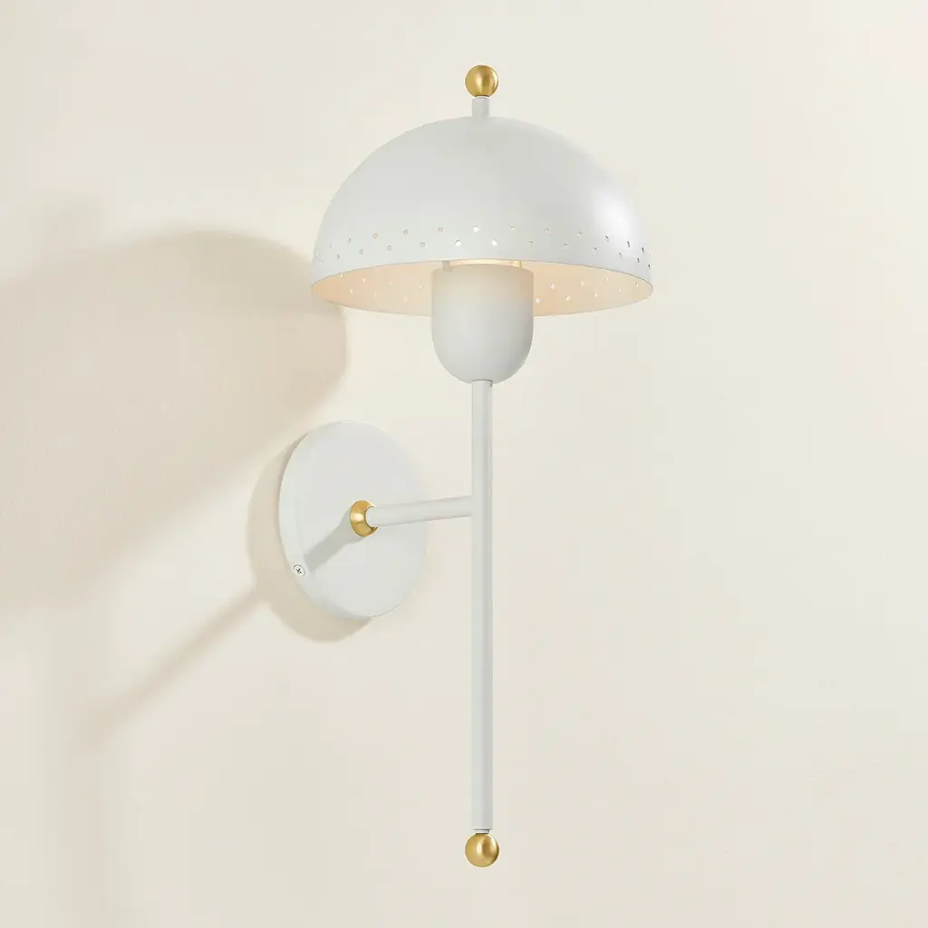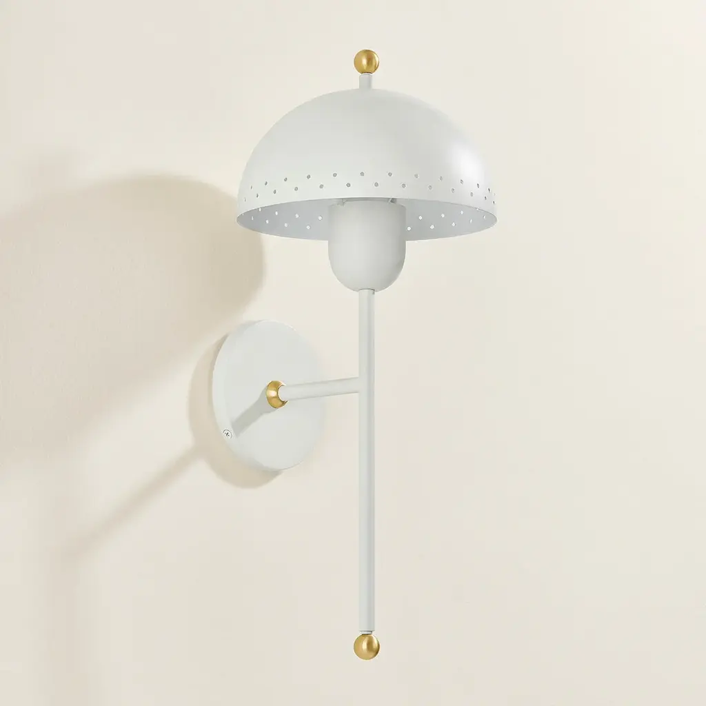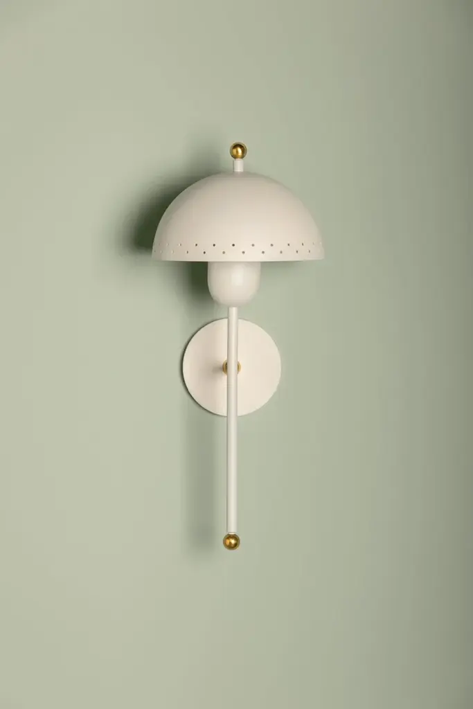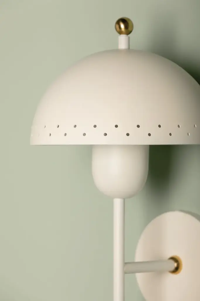 Influenced by midcentury design, Jojo features a dome-shaped shade with decorative perforations that allow light to escape. Both the pendant and sconce come in a Soft White finish while the lamp is available in a moody green as an eye-catching accent piece. The pendant features 2 lights within its bowl, optimizing illumination. All variations are elegantly accented in Aged Brass. Part of our Zoe Feldman collection.