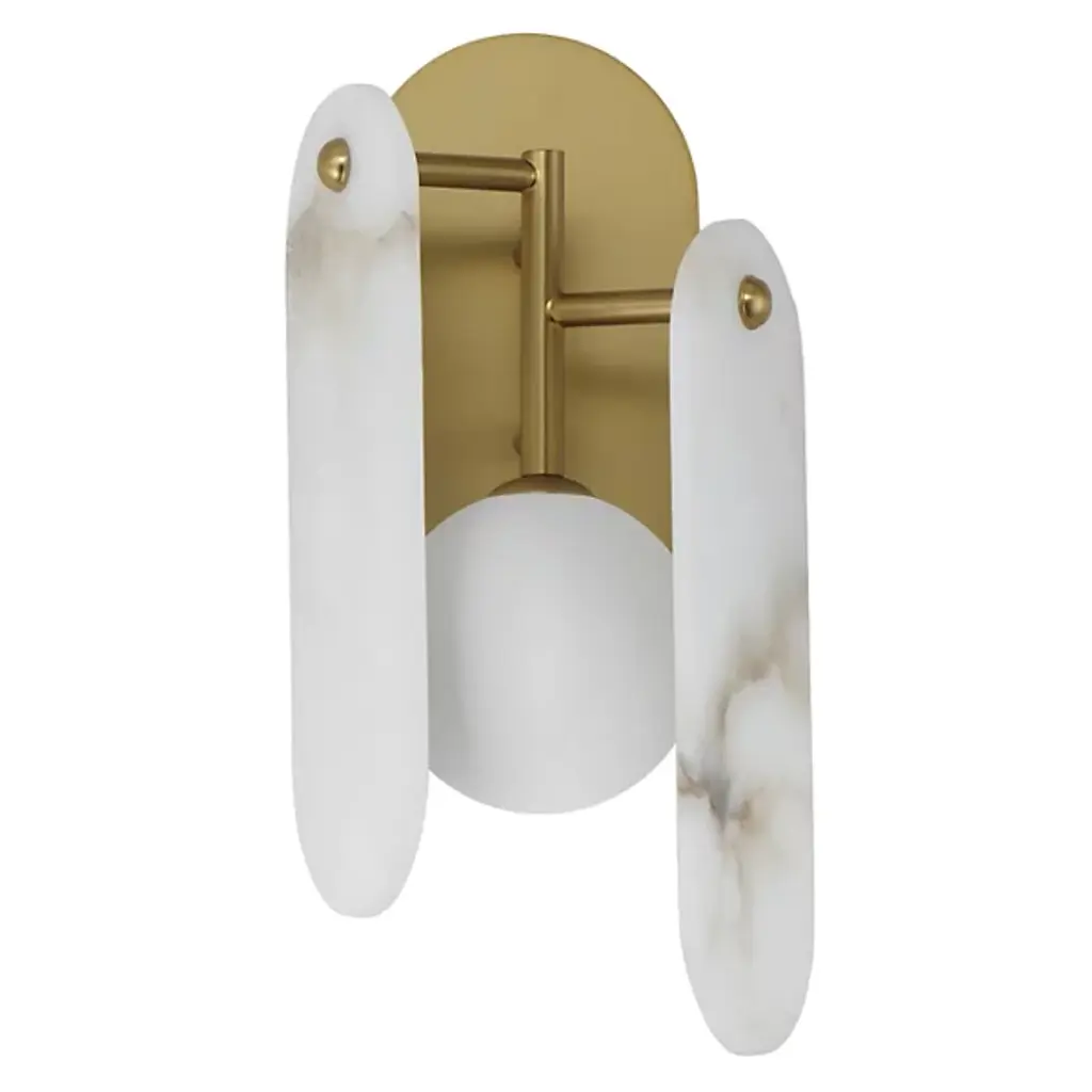 Designed with a hint of Art Deco flair, this sconce radiates organic elegance with its raw-edge alabaster shade and warm brass finish. Hardwired. Due to the use of natural materials, each piece is unique and may vary slightly from image shown.