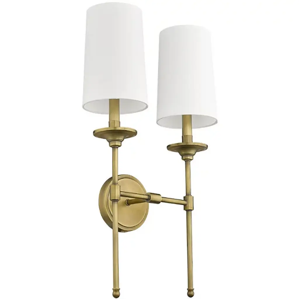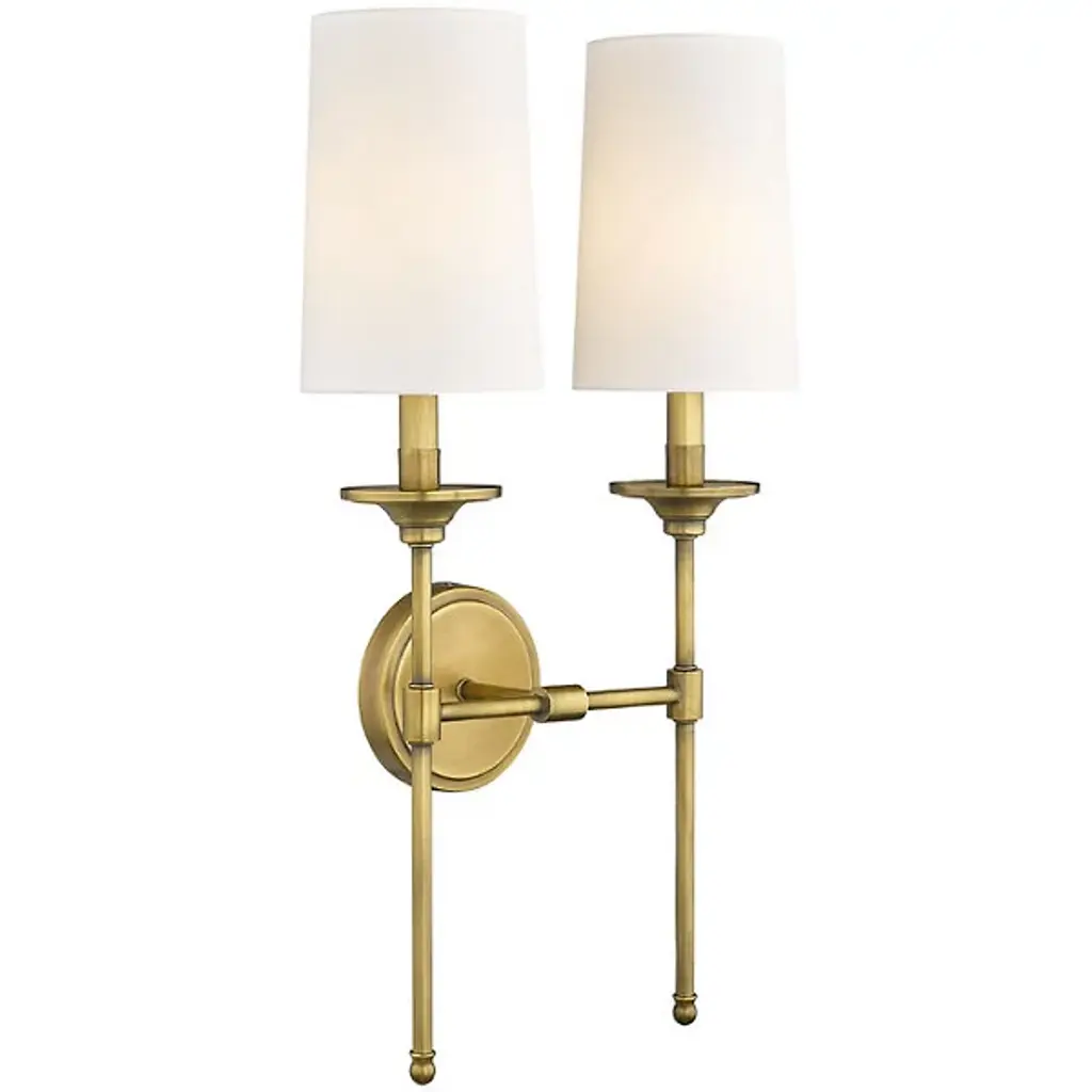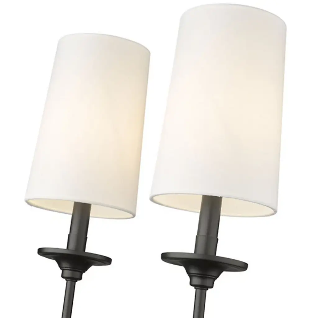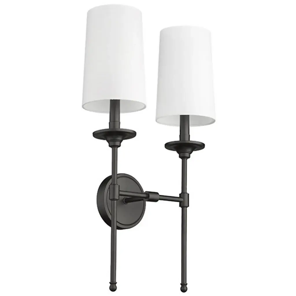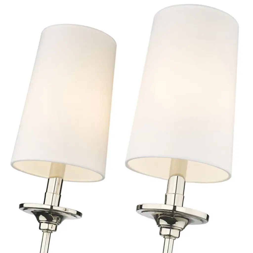 Elevate the ambiance of a traditional bedroom or bathroom with the Jones Wall Sconce from Alder & Ore. Its classic metal frame boasts a gleaming polished nickel finish, enhancing its elegant silhouette. Two off-white cloth shades gently diffuse the light, which creates a soft, inviting glow that sets the perfect mood for relaxation and comfort. This wall sconce is a tasteful addition that complements the aesthetic of any traditional space