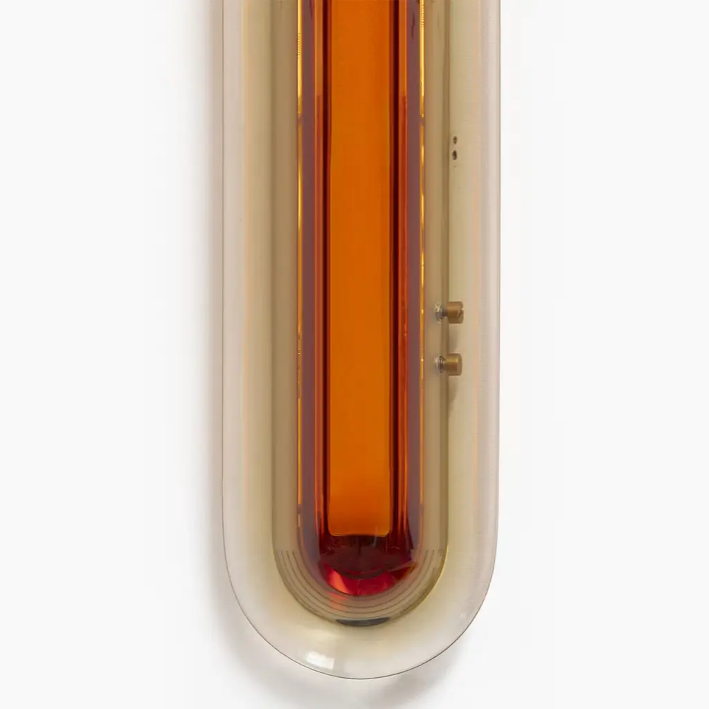 Drawing inspiration from the Space Age, Joy wall lamp emerges as an eye-catching luminous sculpture. Its vibrant colors are meticulously handcrafted in our atelier by layering epoxy resin to obtain ever-unique hues that interact with the dimmable neon and produce a blended glow. The standard version available is hardwired. The lamp features two switches conveniently located on the side of the structure: one for adjusting the light intensity, as it is fully dimmable, and one for turning the lamp on and off. The Joy lamp is available in two different sizes and a variety of colors.