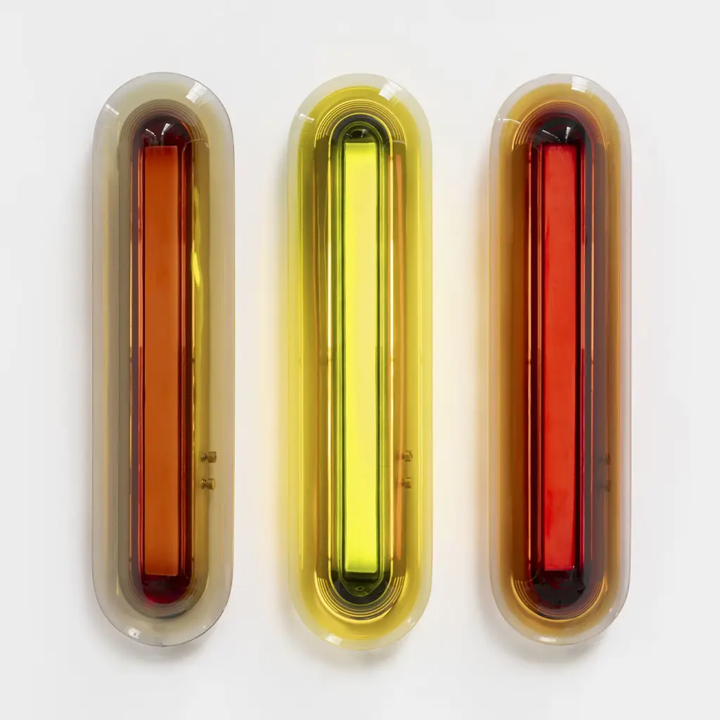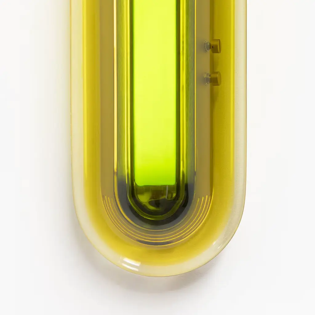 Drawing inspiration from the Space Age, Joy wall lamp emerges as an eye-catching luminous sculpture. Its vibrant colors are meticulously handcrafted in our atelier by layering epoxy resin to obtain ever-unique hues that interact with the dimmable neon and produce a blended glow. The standard version available is hardwired. The lamp features two switches conveniently located on the side of the structure: one for adjusting the light intensity, as it is fully dimmable, and one for turning the lamp on and off. The Joy lamp is available in two different sizes and a variety of colors.