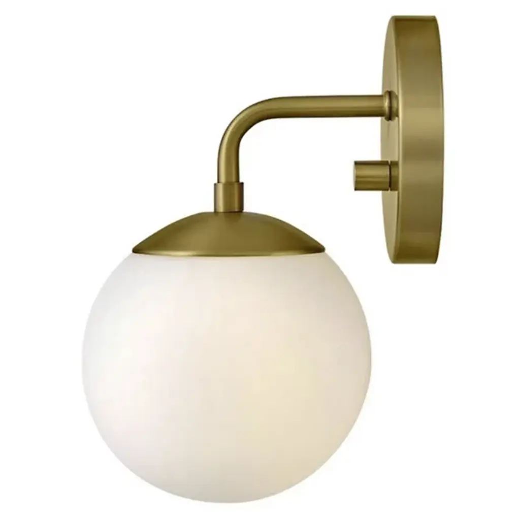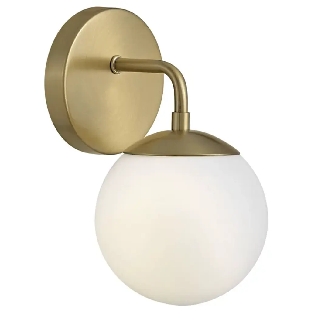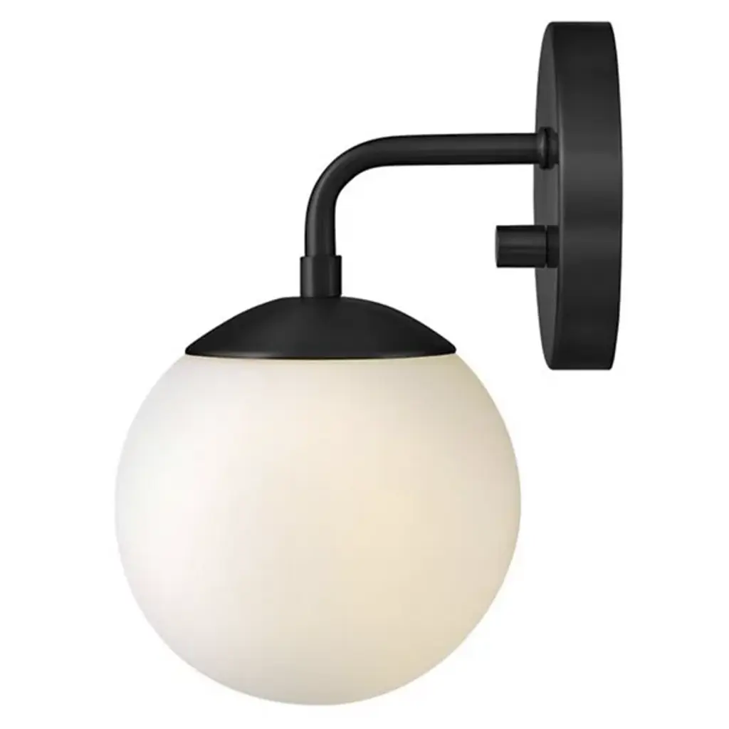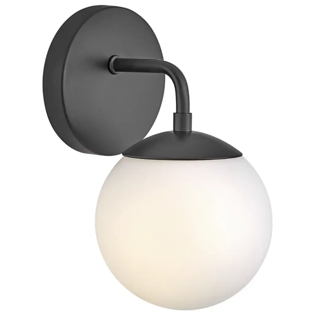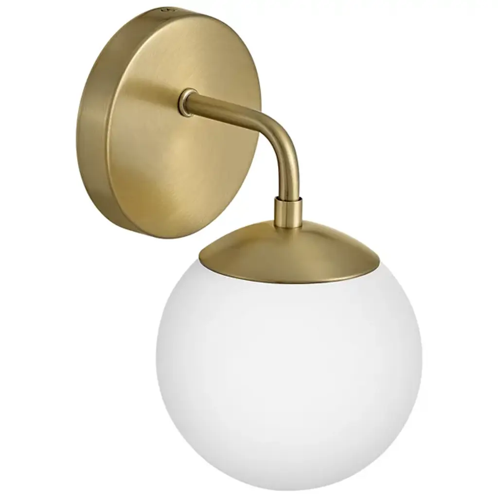 Bring a pleasing modern presence to your walls or hallways with the elegant simplicity of the Julep Wall Sconce from Lark. Retained by a low-profile disc wall plate, it can be mounted up or down and extends a curving arm to a dish-shaped cap surrounding a damp-listed candelabra lamp. Ideal when placed on either side of a bathroom mirror, any excess glare is gentled with ease by a spherical shade of etched opal glass, transmitting a stately, appealing warmth out around the fixture.