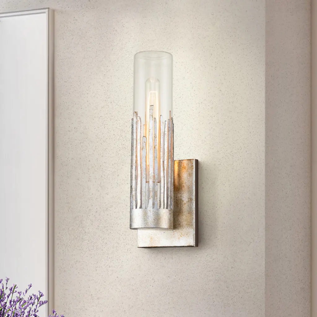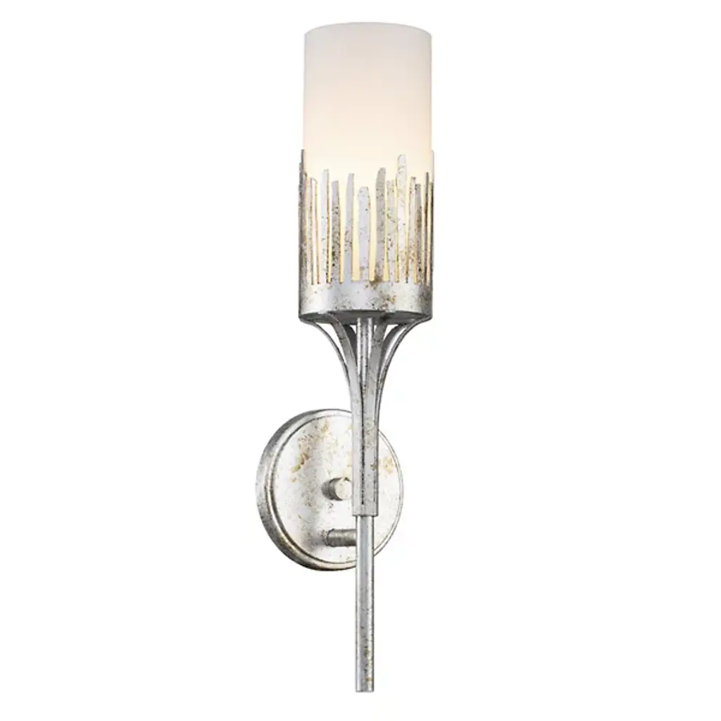 Julia 1 Lt sconce in silver leaf. Grass like pattern offered in transitional design with glass candle cover of 1 60w light of ADA compliant sconce