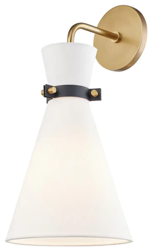 Along its midcentury-modern shade of linen, Julia clasps a cuff of contrasting metals like a single statement piece of jewelry.