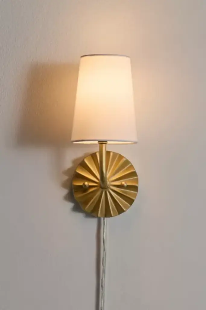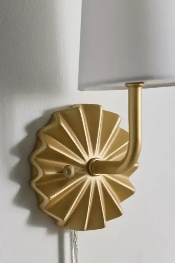 Refresh your bedside lighting with this wall light featuring a resin-crafted base in a pleated, circular silhouette. Topped with a tall and tapered woven drum lamp shade. Available exclusively at Urban Outfitters. **Features** \- Julie Pleated Sconce from UO Home’s Julie lighting collection \- Mid-century modern wall light \- Resin base in a pleated silhouette \- Tall, tapered fabric lamp shade \- Plug in; inline switch \- Requires one E12 Type C 7W bulb - not included \- UO exclusive **Content + Care** \- Assembly required - assembly instructions and hardware are included \- Plastic resin, iron, fabric \- Wipe clean \- Imported \- Made in compliance with US electrical standards. To use this item outside of the US, pair with an outlet adapter and voltage converter made specifically for use in your location. **Size** \- Wattage/Voltage: 7W/120V \- Base dimensions: 4.7"dia x 0.8"h \- Shade dimensions: 3.5"dia x 4.6"h \- Cord length: 7 ft \- Weight: 1.7 lbs \- Shipping package dimensions: 7.9"l x 7.9"w x 11.8"h \- Shipping package weight: 2.1 lbs