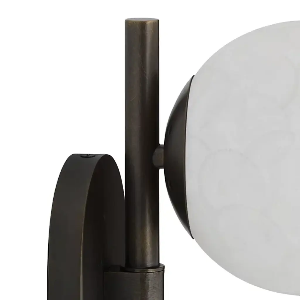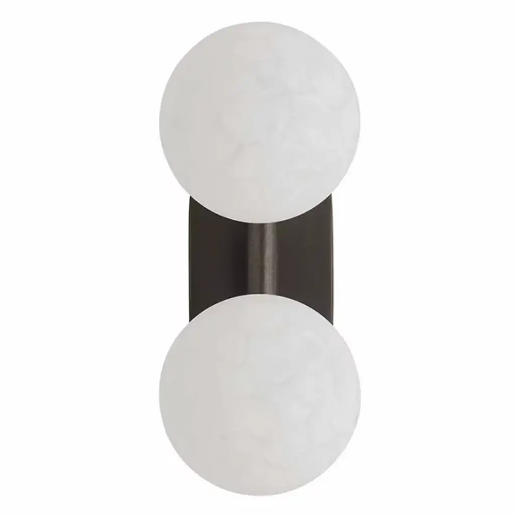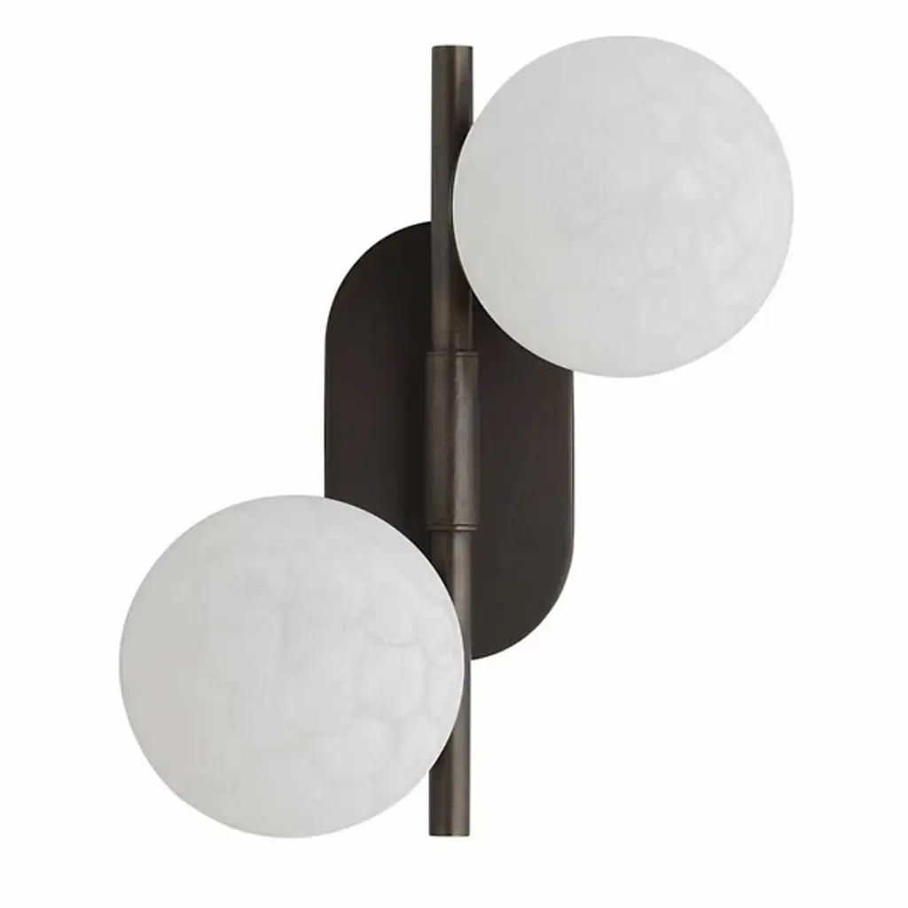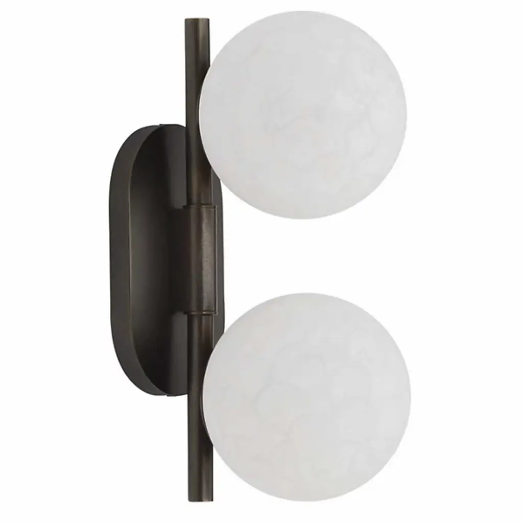 The Julie Wall Sconce from Arteriors pairs dual globes of textured glass with a celestial-inspired mounting system that recalls lunar orbits. Each globe features a coral-like surface treatment that diffuses light while adding tactile interest to the smooth spherical forms, and the steel backplate receives an English bronze finish that grounds the lighter glass elements. Its innovative design allows both globes to rotate independently, directing illumination precisely where needed most.