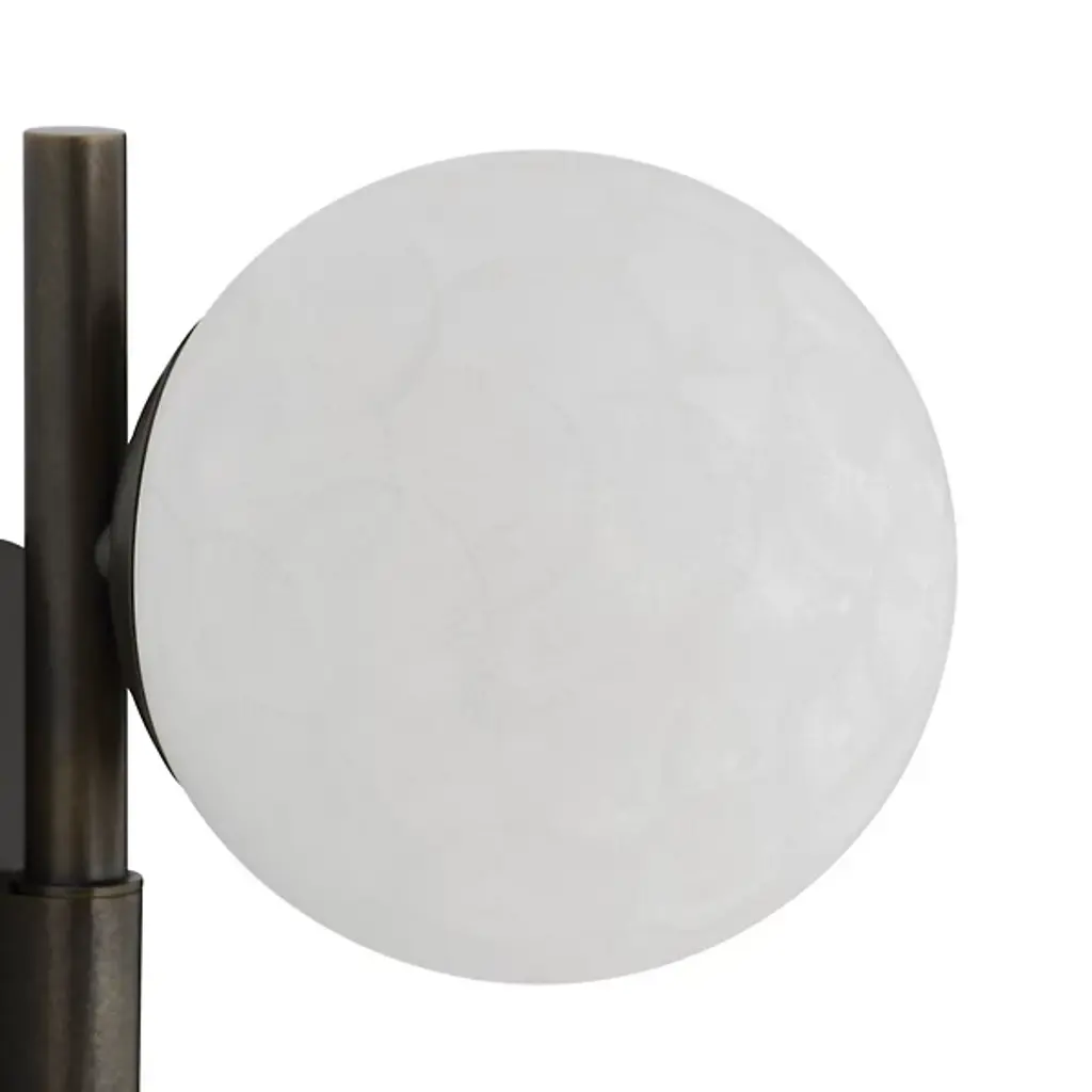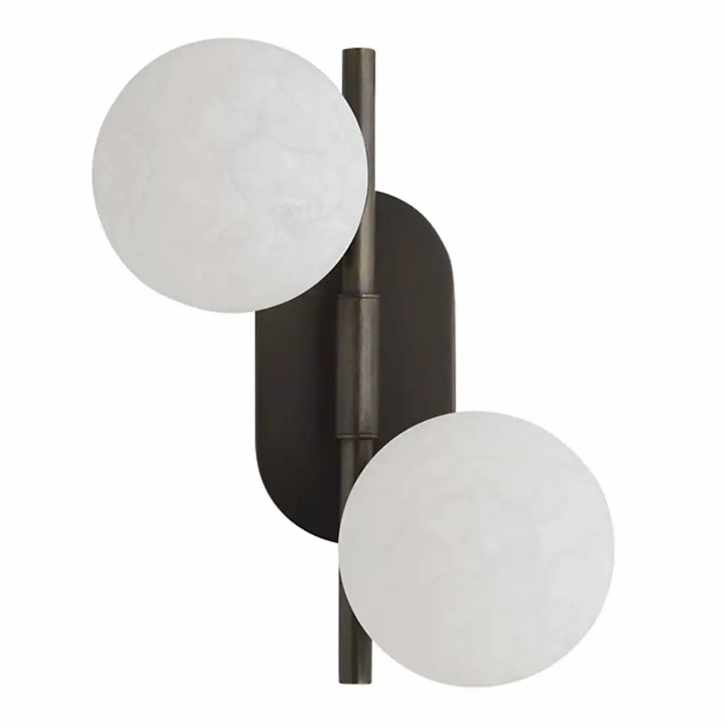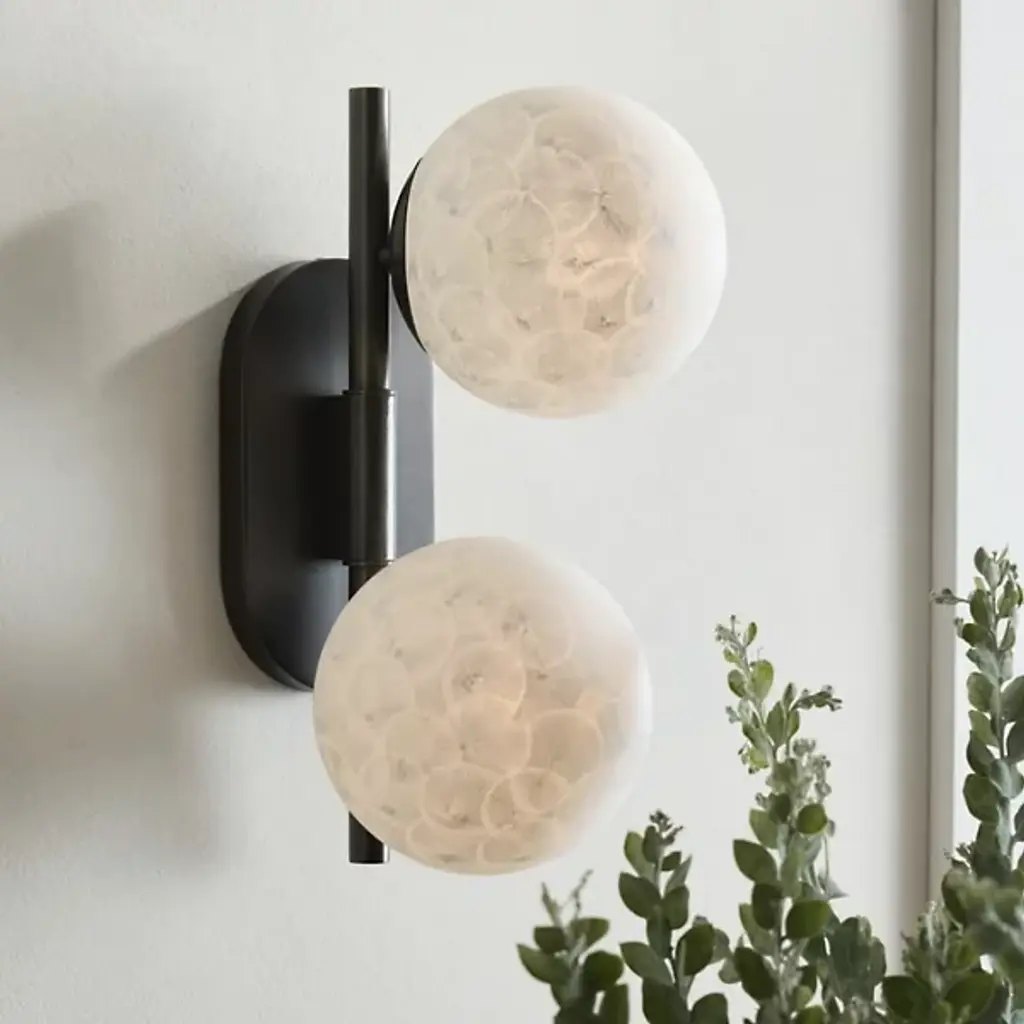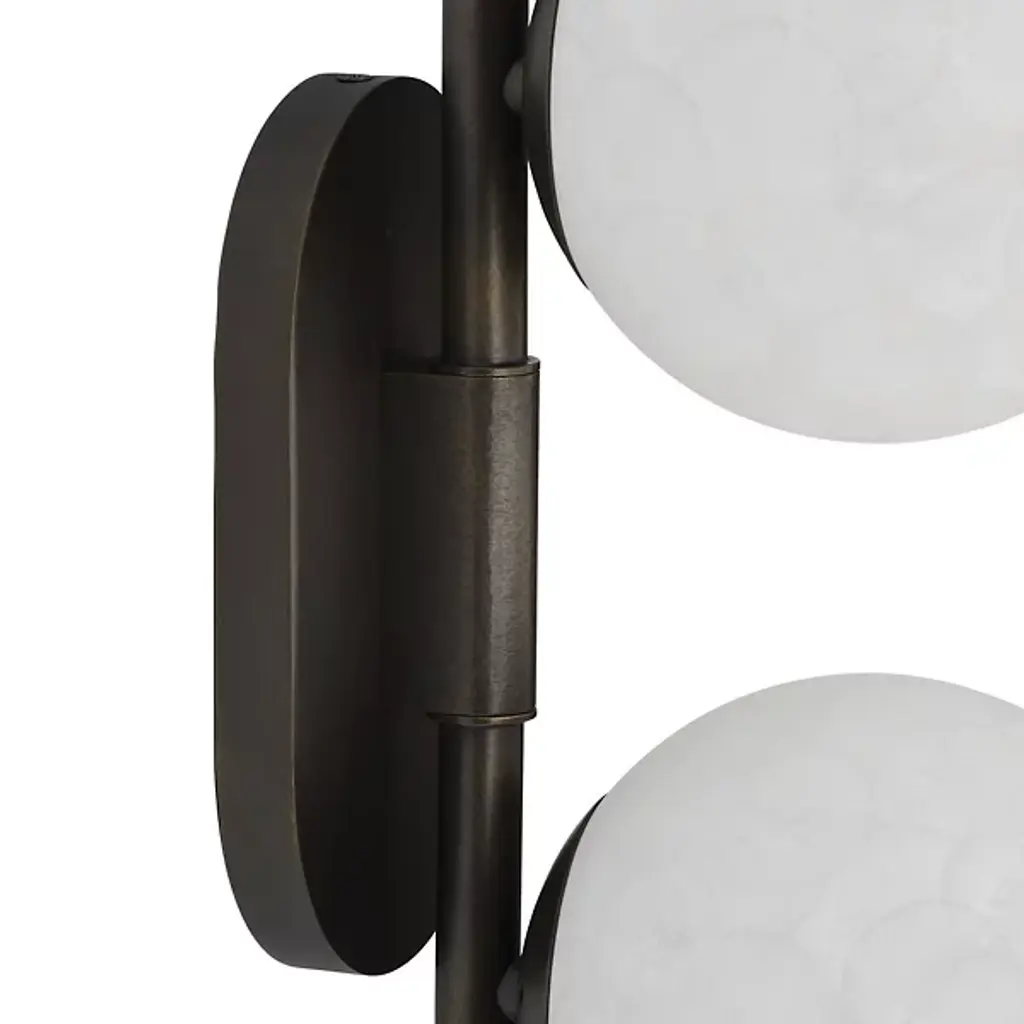 The Julie Wall Sconce from Arteriors pairs dual globes of textured glass with a celestial-inspired mounting system that recalls lunar orbits. Each globe features a coral-like surface treatment that diffuses light while adding tactile interest to the smooth spherical forms, and the steel backplate receives an English bronze finish that grounds the lighter glass elements. Its innovative design allows both globes to rotate independently, directing illumination precisely where needed most.