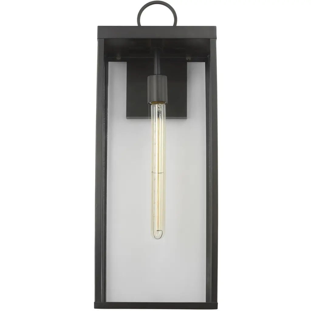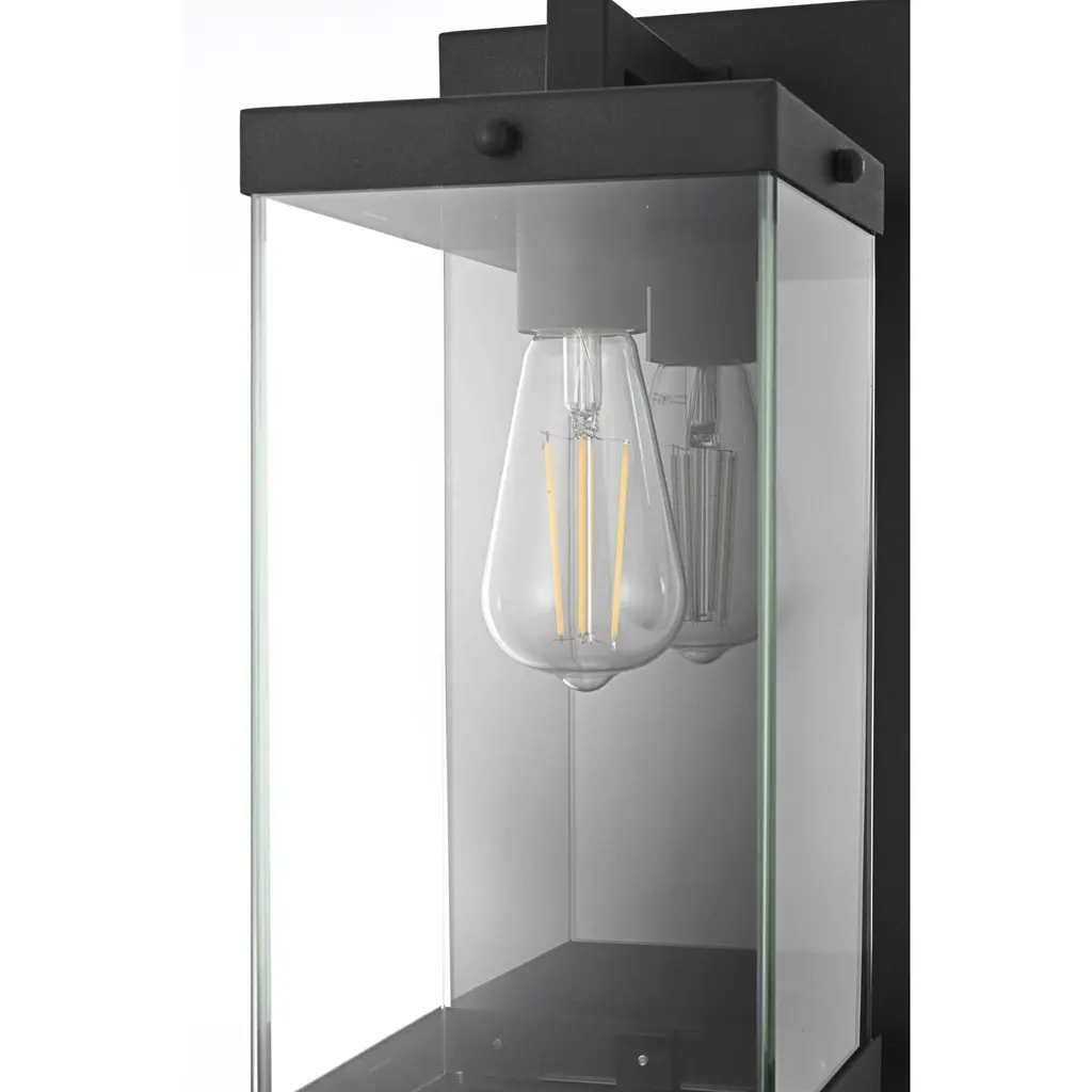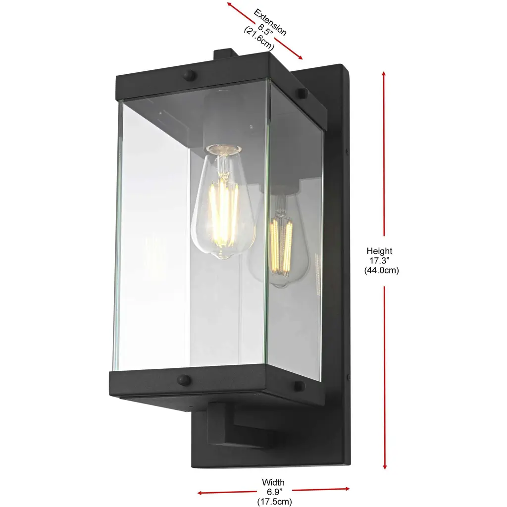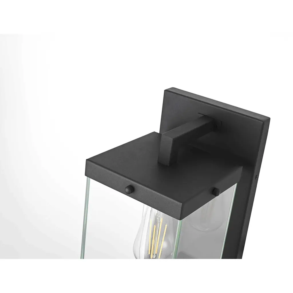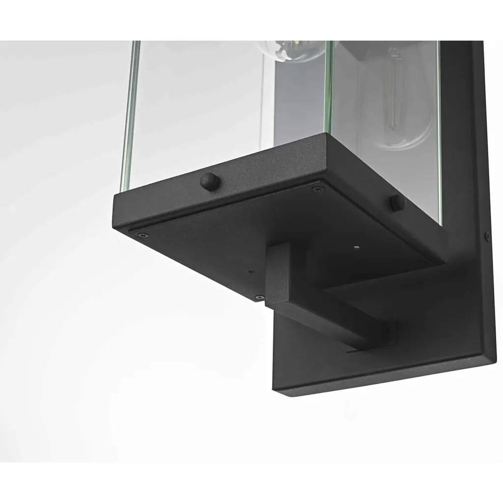 Elevate your outdoor lighting with this refined modern box lantern, designed for both style and durability. Crafted from high-quality iron with a sleek matte black finish, this fixture features a clean-lined rectangular frame accented by clear glass panels for maximum illumination. The enclosed bottom, secured with screws, enhances the structures durability while protecting the bulb from direct exposure. A floating arm mount adds a touch of architectural elegance, making this fixture an eye-catching addition to any exterior. Designed with an E26 socket (bulb not included), it offers versatility in lighting choices to suit your space. Wet rated for outdoor resilience, this fixture is perfect for patios, entryways, and exterior walls, blending contemporary aesthetics with functional brilliance.