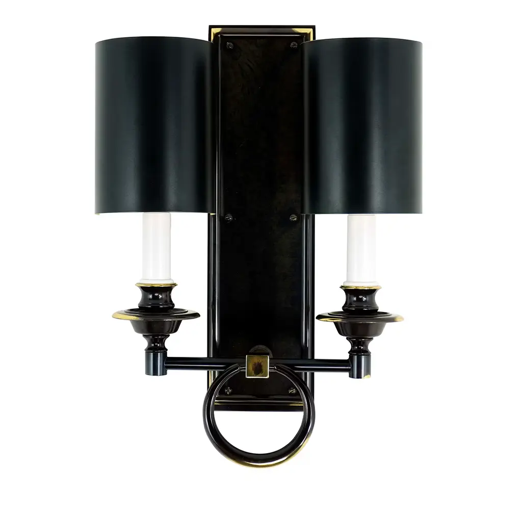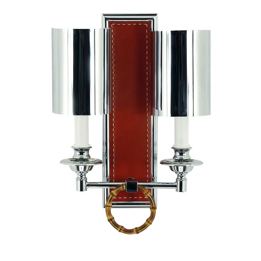 This brass wall lamp flaunts a captivating eclectic design incorporating exotic and tailored details that make it unique. A bamboo ring adorns the straight tubular element, while fine brown leather covers the rectangular wall plate finished in a bright golden hue. Curved, black-lacquered metal sheets shade the light produced by the two E14 LED bulbs (40W each). A chrome-finished variant can be found in the Artemest catalog.
