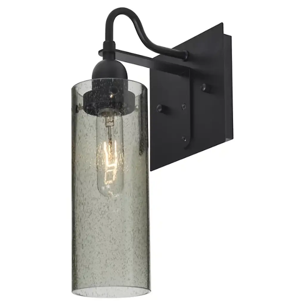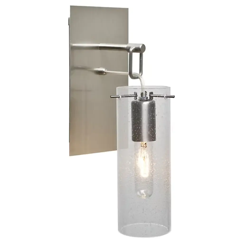 Reinvent your living space with the industrial-inspired Juni 10 Hanging Wall Sconce by Besa Lighting. Its sophisticated design contrasts a clean, handcrafted Bubbled Glass shade with a rugged, Aluminum wallplate, standoff, and suspension cord. Lighting comes courtesy of an internal filament bulb that, once lit, radiates through the bubbles for a warm, yet glistening effect.