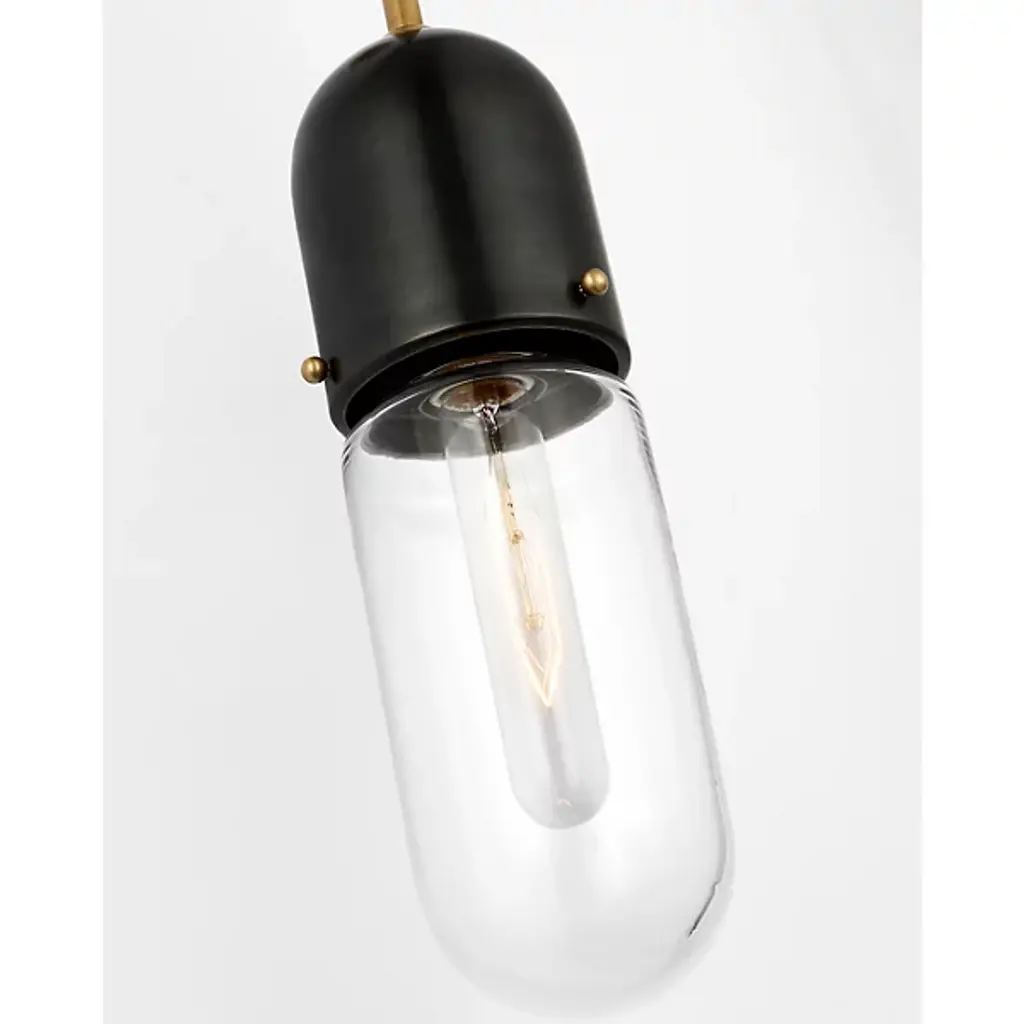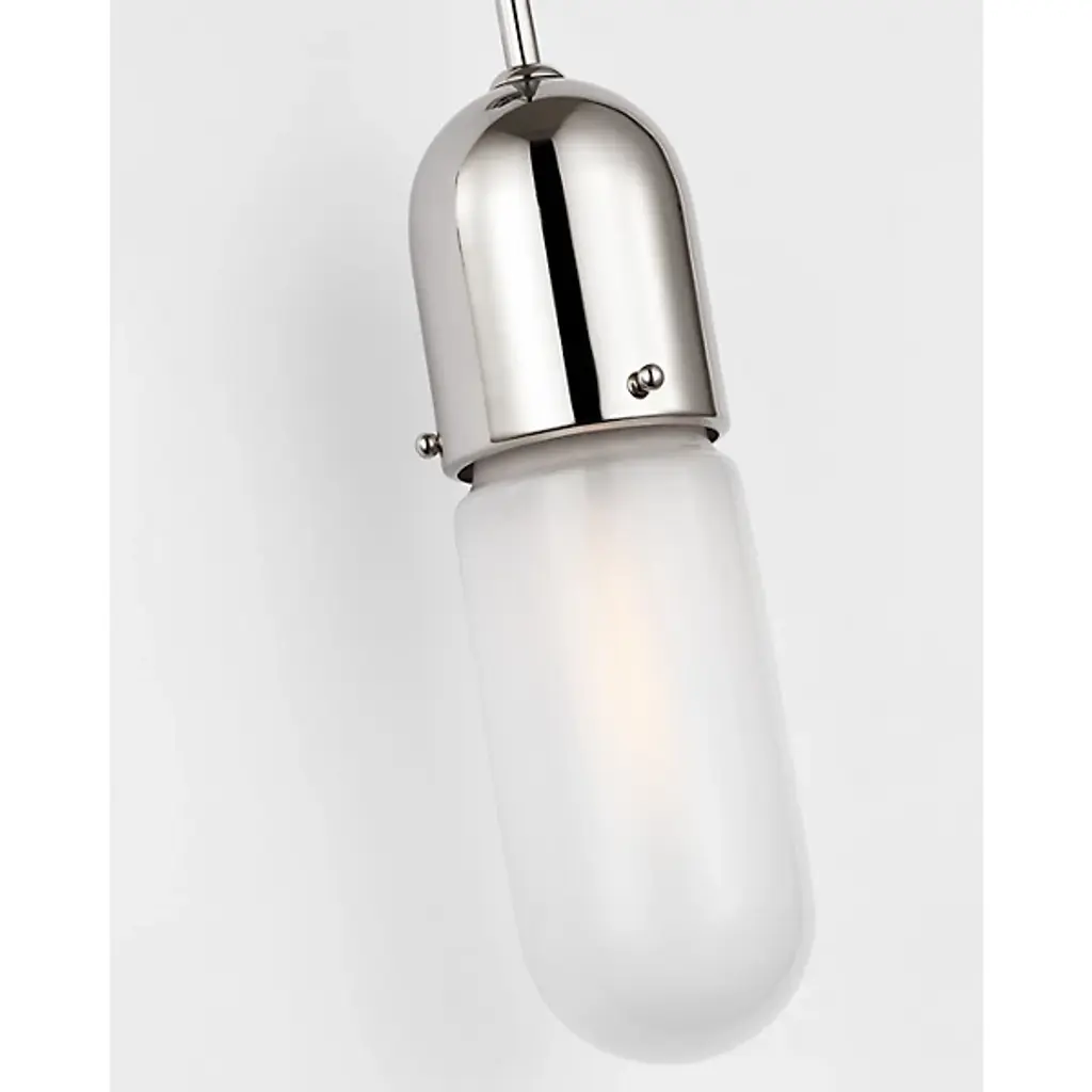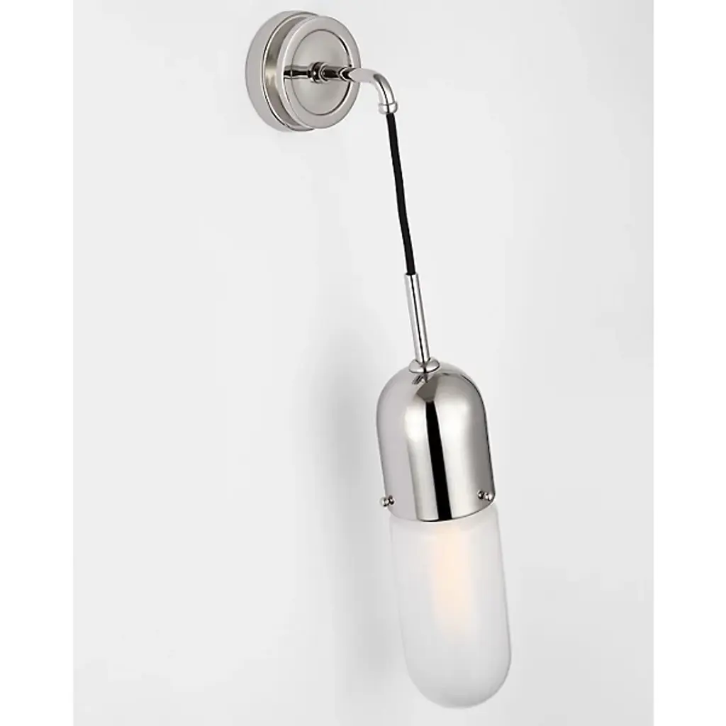 Provide a stately, vintage accent to indoor wall spaces with the Junio Wall Sconce from Visual Comfort. Designed by Thomas O'Brien, a contoured, circular wall plate secures the fixture, extending a slender, downward-curving stem out from the center of the mount, dispatching a short length of cord to a capsule-shaped housing for retro-style lamping. A glass diffuser extends around the lamping, cutting glare and dispatching an even warmth while keeping the lamping on full display.