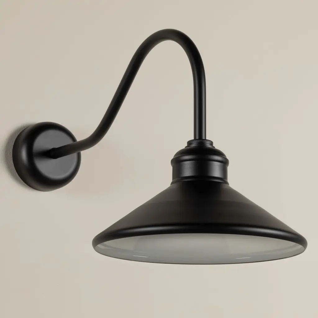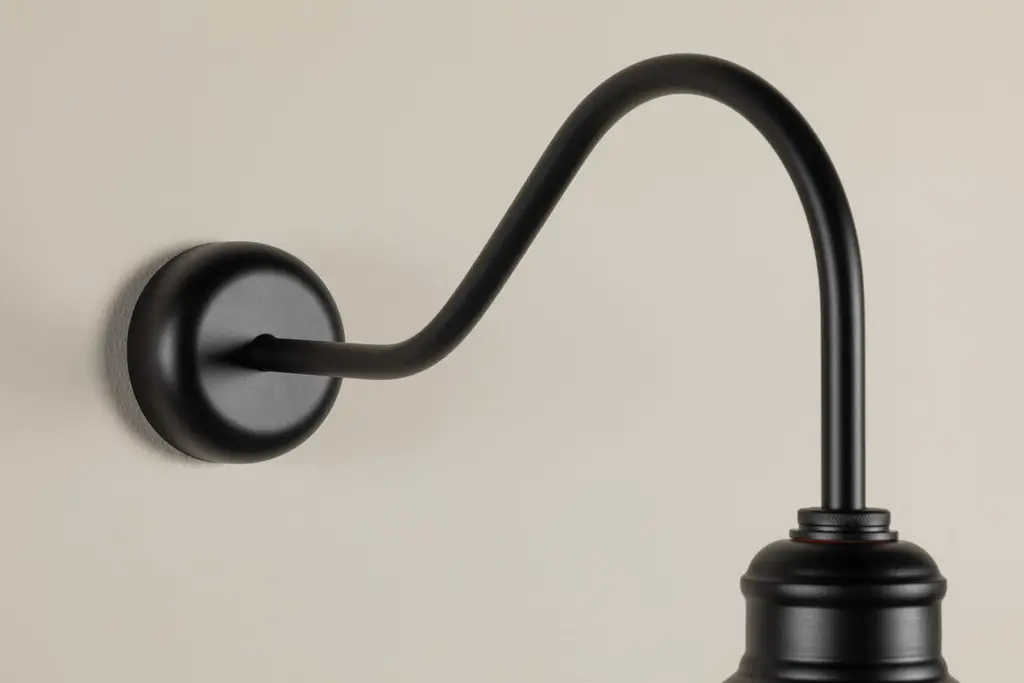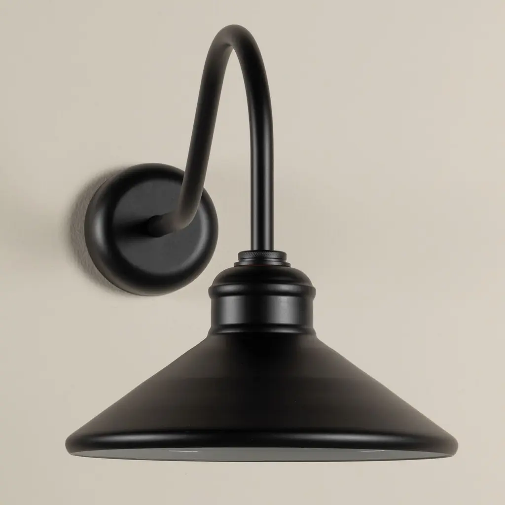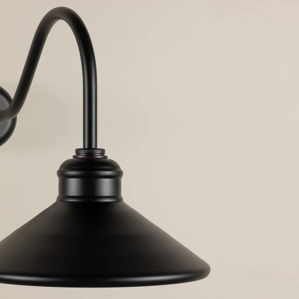 Paying homage to the 1950s, Kaelia blends industrial style with sweeping curves. A graceful gooseneck arm supports a sharply tapered shade and caged light source. The allover Matte Black coating adds a timeless finish to this vintage-inspired exterior wall light.