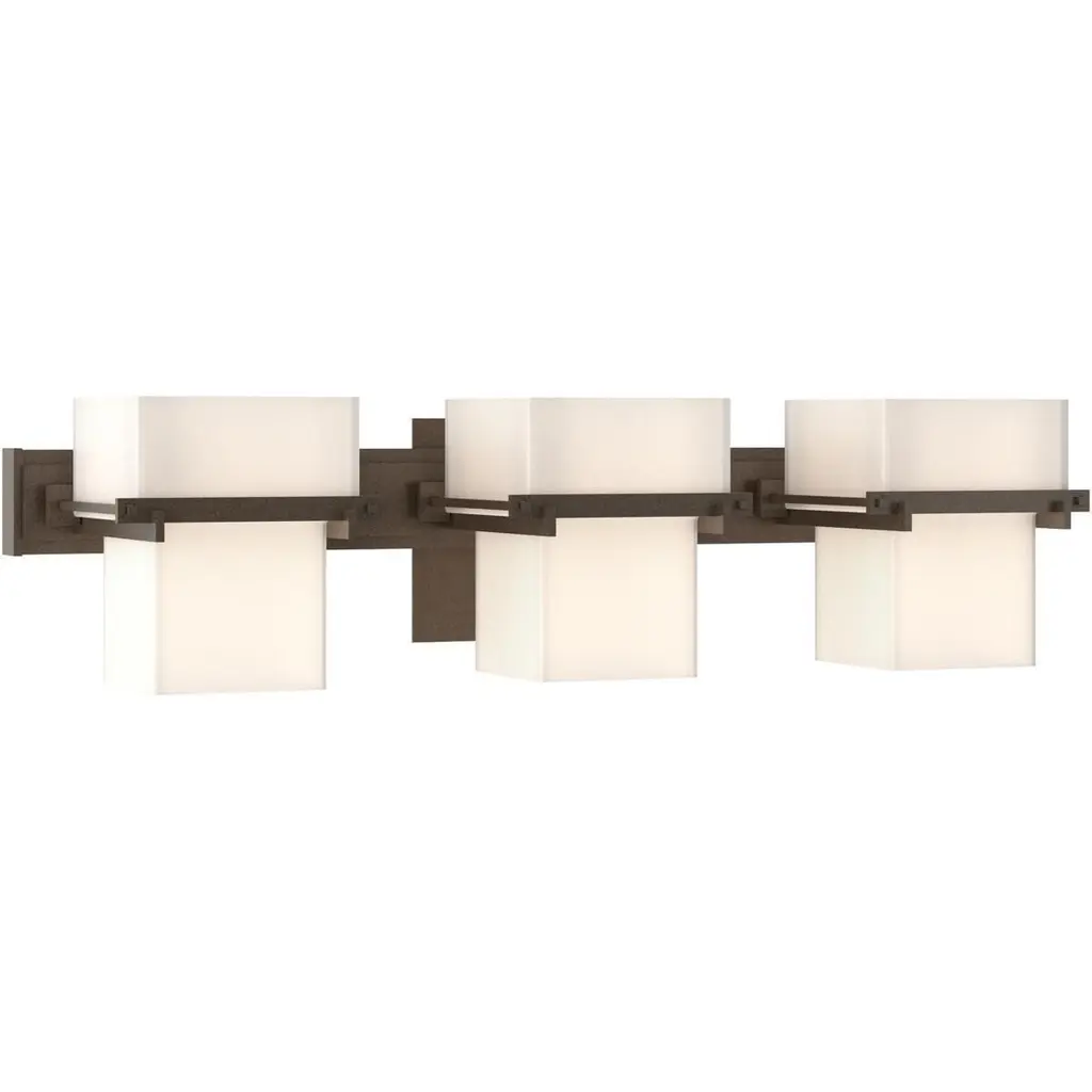 From the mounting plate to the hand-forged steel bars outlining the two-tiered glass, our Kakomi Three Light Sconce is a collection of lines and planes. Whether installed in a square room for visual harmony or a room of a different shape to create striking contrast, it works.