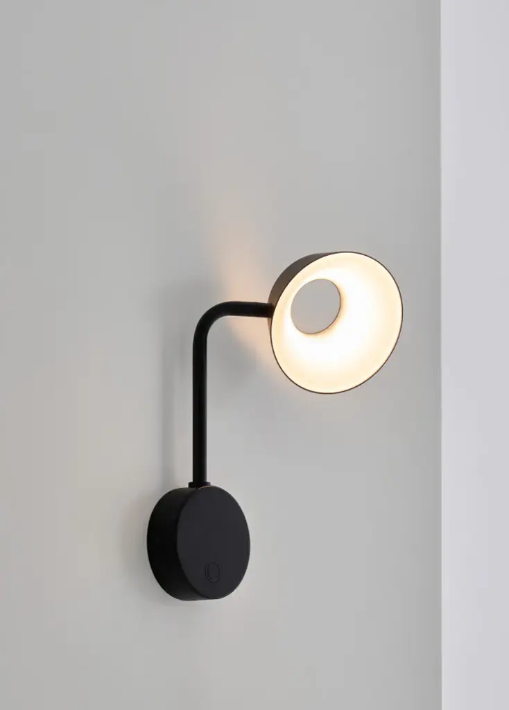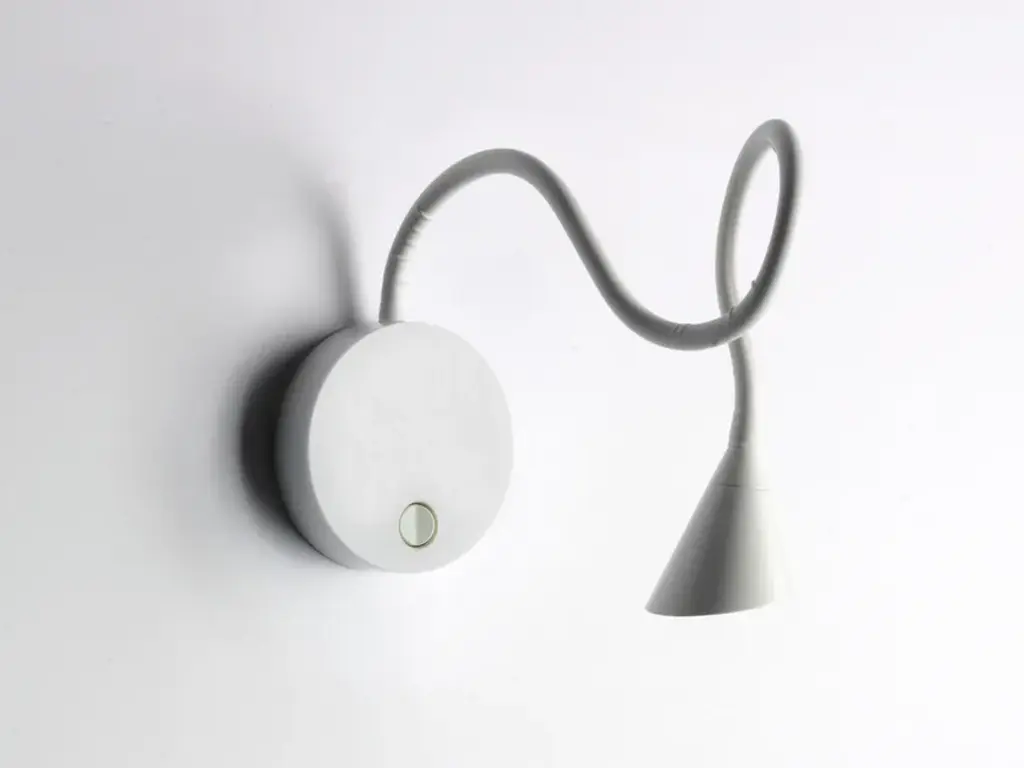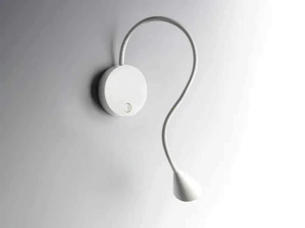 Flexible and adjustable wall lamp with direct light. Structure in aluminum and ABS. The flexible arm in harmonic steel is covered in heat-shrink sheath. The power LED, the driver and the switch are integrated.The small size, the simple but captivating line and the proposals in different colors make KALLA an extremely versatile lamp; ideal as a reading lamp at the head of the bed, it can also be used in corners of living rooms next to bookcases or showcases or as an accent light to highlight objects or furnishing components.Source: LED 1W 113lm 3000KLight: directFinishes: .01 White, .02 Black, .06 Green, .09 Orange, .10 Light Blue, .11 Pink KALLA is an adjustable table and wall lamps with or without switch.
