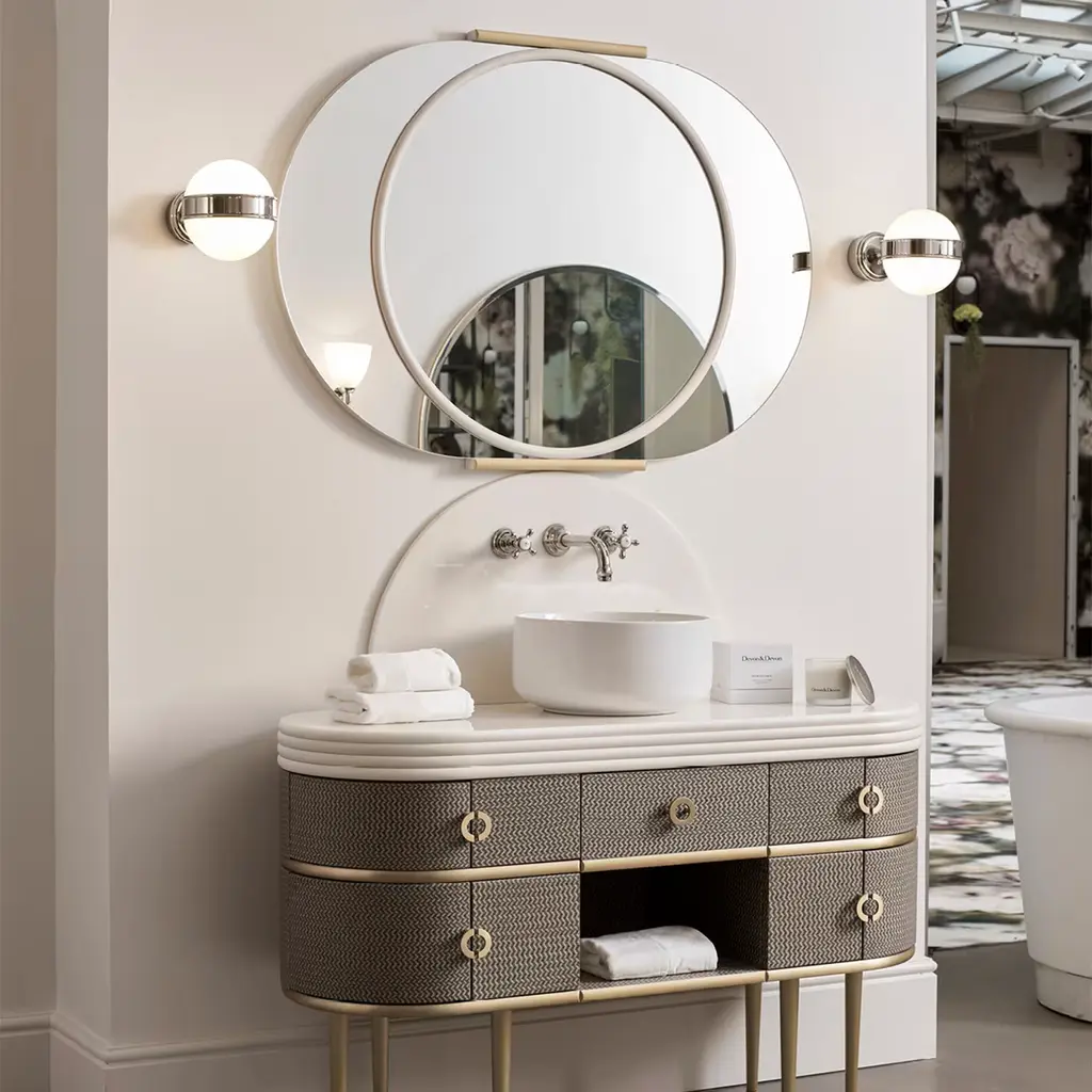 The result of the collaboration with a grand protagonist of contemporary architecture, the elegant wall lamp designed by Massimo Iosa Ghini is ideal for bathrooms with a classic-contemporary taste. Its brass structure is enhanced by refined details of retro inspiration.