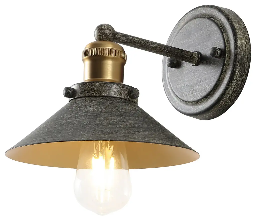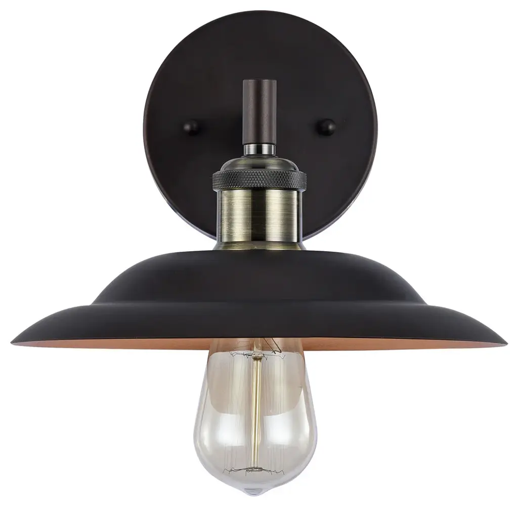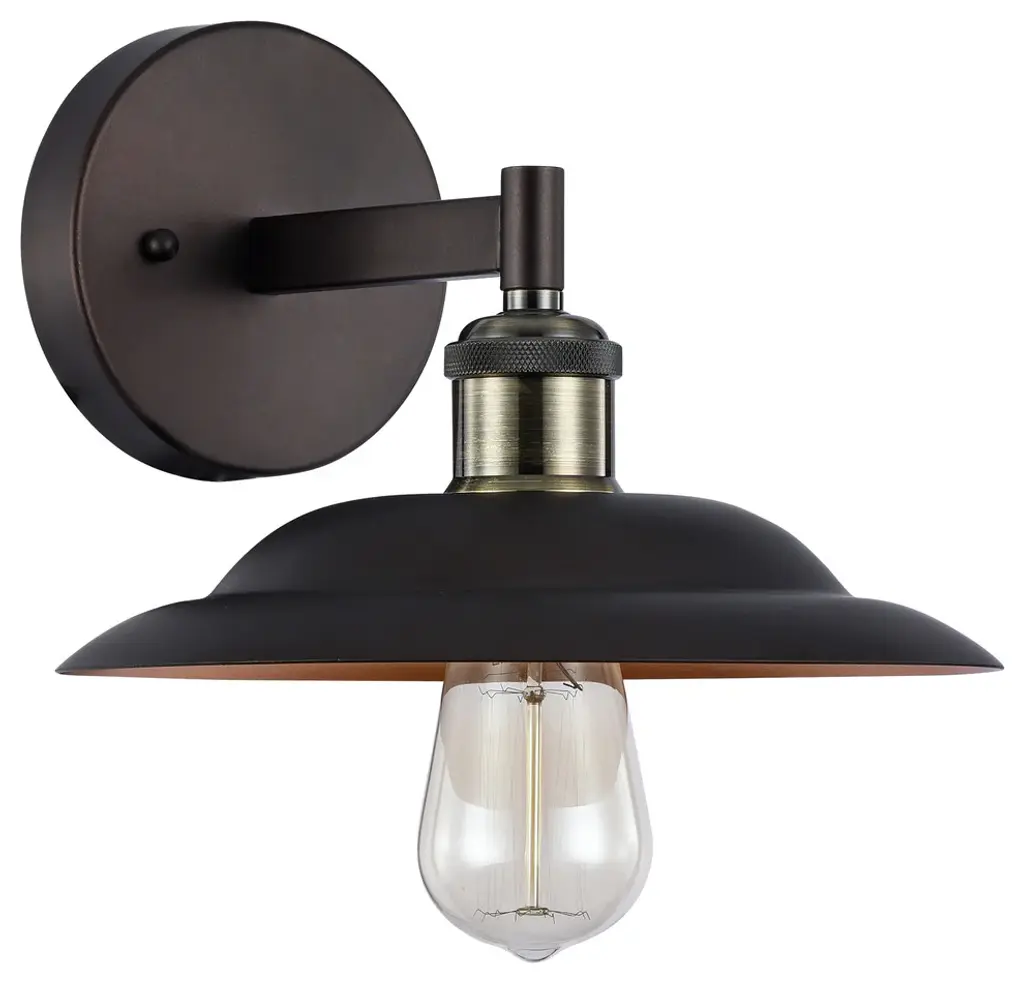 This 1-light wall sconce features an oil rubbed bronze finish that will complement many urban, loft, industrial and transitional decors. The matching metal shade has a contrasting gold inside that will create a warm glow to any space. One (1) 60 watt vintage Edison bulb included.(1) 100 Watt max E26 Type A Bulb (60w ST58 included)Hardwired, Wall outlet switchMetal ShadeDownlightIndoor Setting