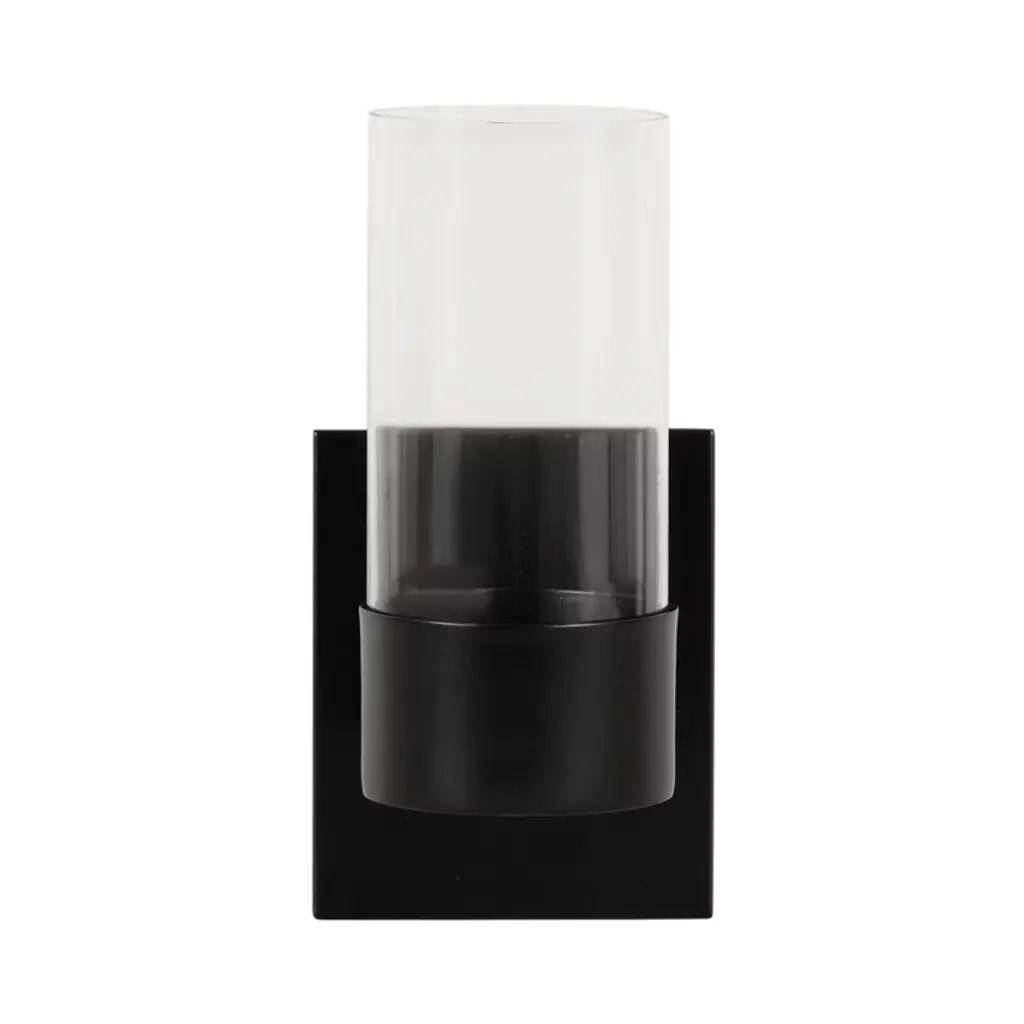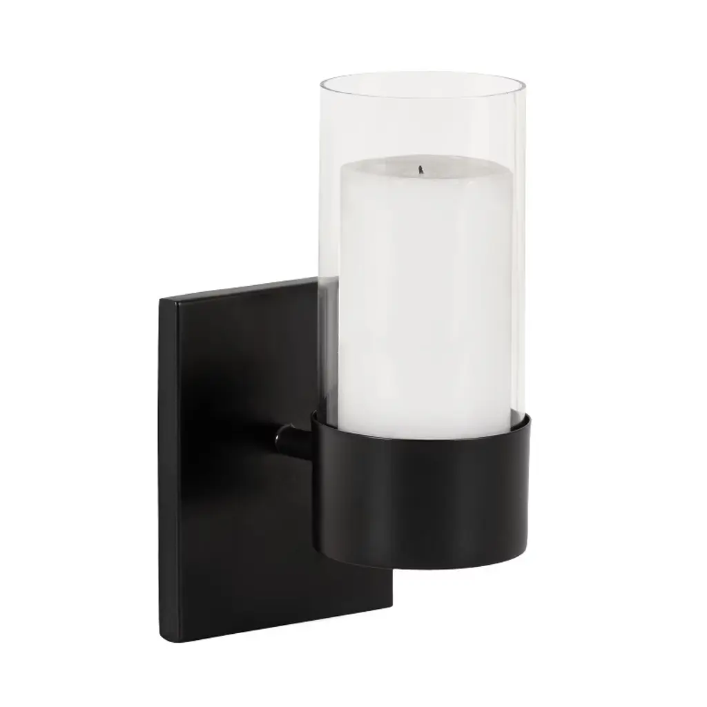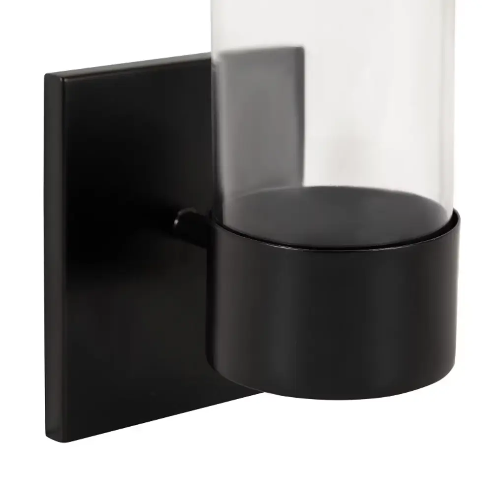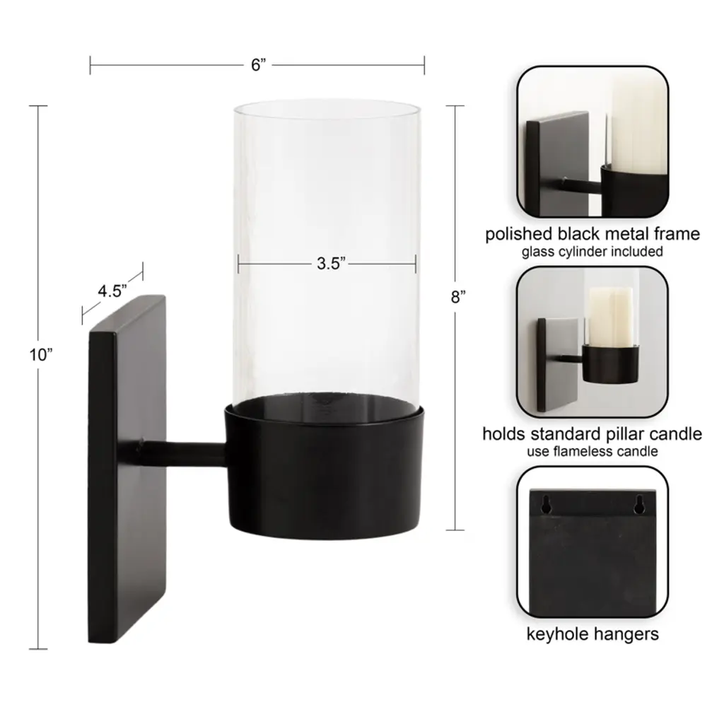 Elevate your home decor with the Kate and Laurel Zabler metal wall sconce. Crafted with meticulous attention to detail, this decorative sconce features a durable metal construction finished in stunning satin black, imparting a touch of modern charm to any room. The contemporary round candle holder not only serves as a stylish accent but also offers a practical solution for enhancing the ambiance with flameless candles. Another highlight of this sconce is the removable glass cylinder, thoughtfully designed to beautifully showcase your favorite candles. Whether adorning your living room, bedroom, or hallway, the soft glow emanating through the glass cylinder creates a mesmerizing visual impact and a hint of light. This versatile candle sconce is 4.5 inches wide by 6 inches deep by 10 inches tall. This timeless wall sconce seamlessly combines form and function, making it an ideal choice for those who appreciate a harmonious blend of style and practicality in their home decor. Transform your space with this versatile wall sconce, effortlessly bridging the gap between traditional and contemporary aesthetics.