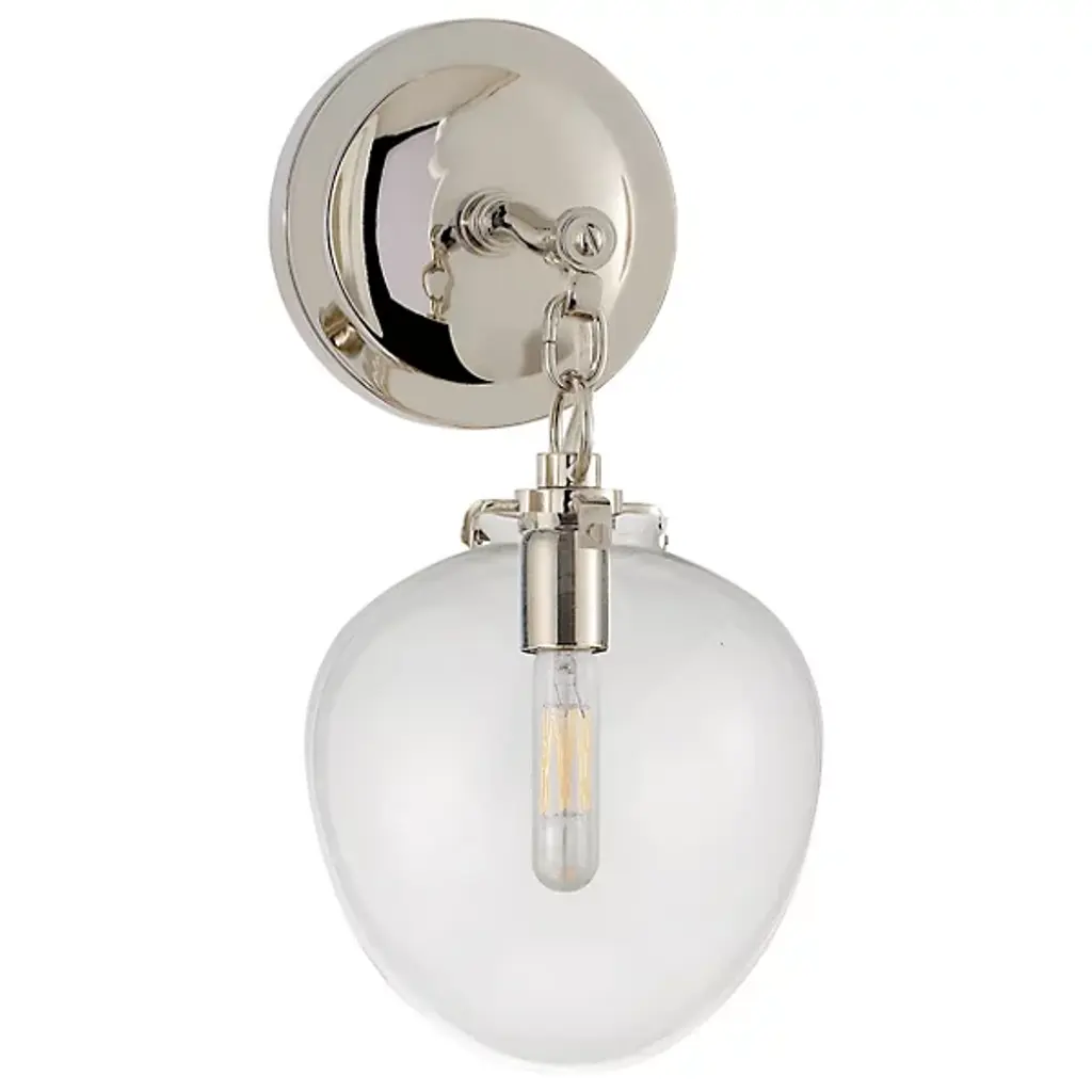 The Katie Acorn Wall Sconce from Visual Comfort Signature is a stunning lighting fixture that was designed by Thomas O’Brien. This beautiful wall sconce is composed of an airy orb of glass that dangles from chain-link, creating a mesmerizing visual effect as it diffuses light in all directions. Katie Acorn Wall Sconce is suitable for all interiors, as well as outdoor locales protected from the elements, making it a fantastic addition to locales of choice.