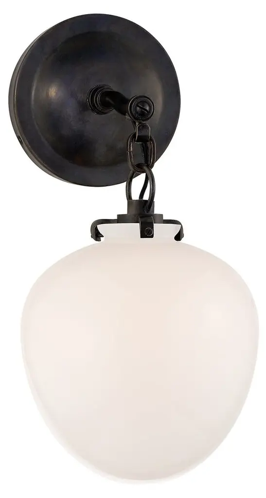 Bold and bright. The Katie Small Globe Wall Sconce from Visual Comfort Signature, formerly known as Visual Comfort, lifts the spirits of the room with charming form and familiar accenting. It rests against the wall with a metal backplate topped with rustic elements. A fine chain-link lowers the eyes with a suspended visual. The bold finish of the metal hardware creates a popping effect for the smooth white glass below. This glass envelops the lamping in a globe shape that provides uniform and glare-free light diffusion. A flip of the switch sends out a soft, atmospheric glow.