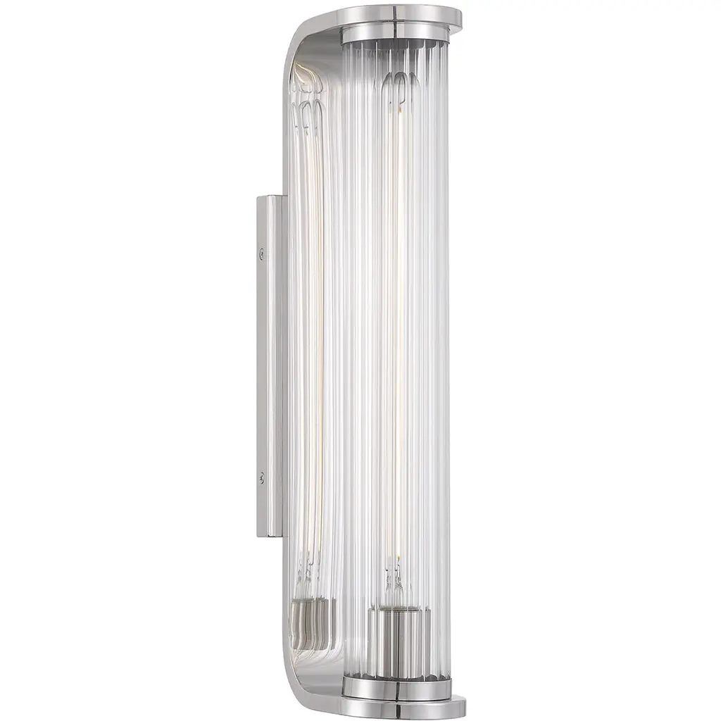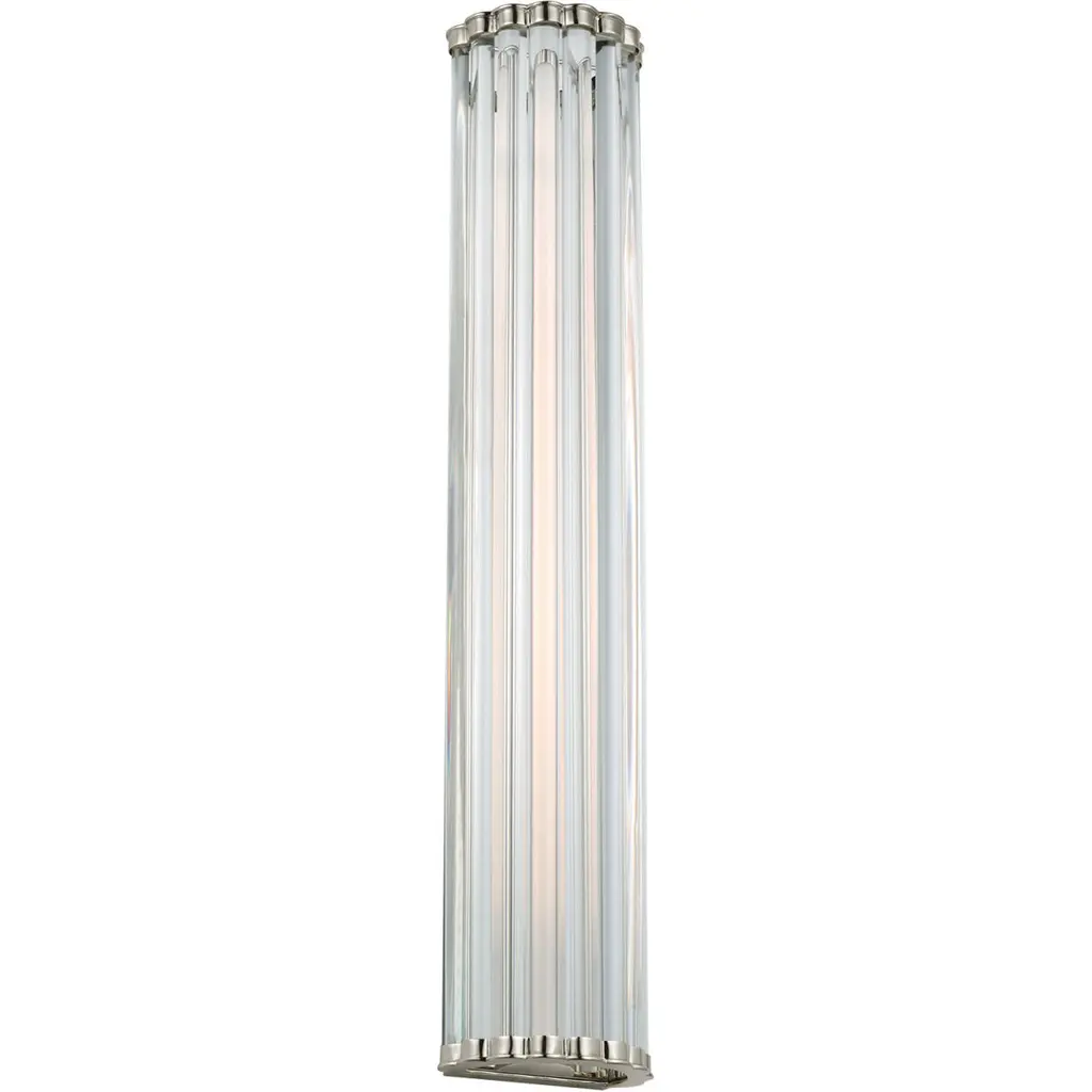 A clever, contoured addition to wall and hallway spaces. The Kean LED Wall Sconce from Visual Comfort Signature, formerly known as Visual Comfort, extends from a rectangular wall plate, seating LED lamping beneath a series of clear glass rods, retained at each end by metal caps with clever, curving accents. This design is outstanding when flanking a mirror, lending a vintage appeal to its surroundings and offering a warm, practical glow that spreads out evenly across its surroundings.