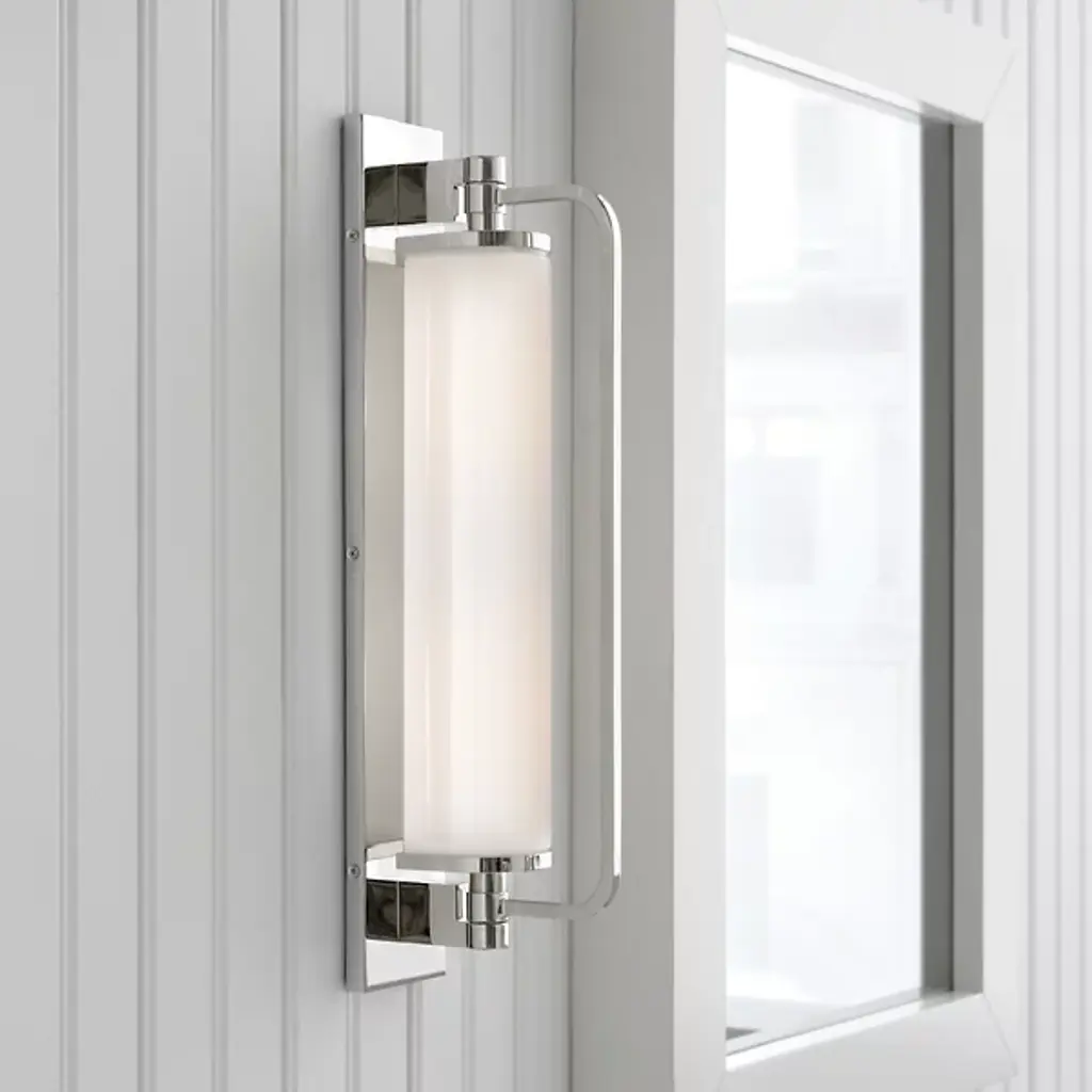 The Keeley Tall Pivoting Wall Sconce by Visual Comfort Signature, formerly known as Visual Comfort, brings design-minded style to your vanity with its unique style, clean lines, and large, cylindrical, White glass shade. These elements combine to smoothly and evenly distribute light in any direction necessary, with added pivot technology. A large, centered handle completes this piece. Dimmable with a standard incandescent dimmer (not included).