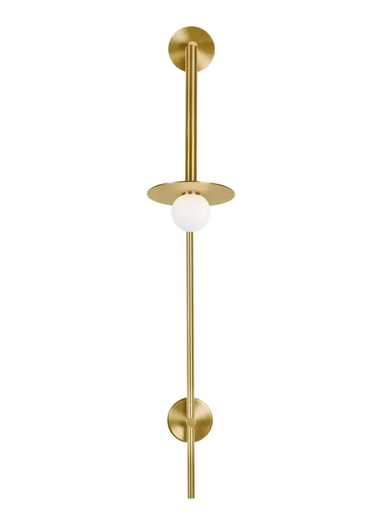 Nodes task, ceiling and wall lighting is minimal yet bold, highlighting Kelly's distinctive juxtaposition of mixed-materiality and curvilinear form. Light radiates from milk glass globes set against metal discs. All fixtures can be used or without the discs. The cast canopy is available in Burnished Brass or Midnight Black. Hanging fixtures within this family feature black fabric cords, while pivot sconces can be cord and plug or hard wire. Designer: Kelly Wearstler Extension: 19 7/8 Backplate: D:4 3/4'' DP:3/4'' OB UP:43 3/4'' Round Switch Location: In Line Switch Type: On/Off Switch Shade/Glass: milk white glass shade Shade Diameter: 3.5 Lamping: 1 T4 G9 60 watt light bulb Voltage: 120 Bulb Included: No Safety Rating Location: damp