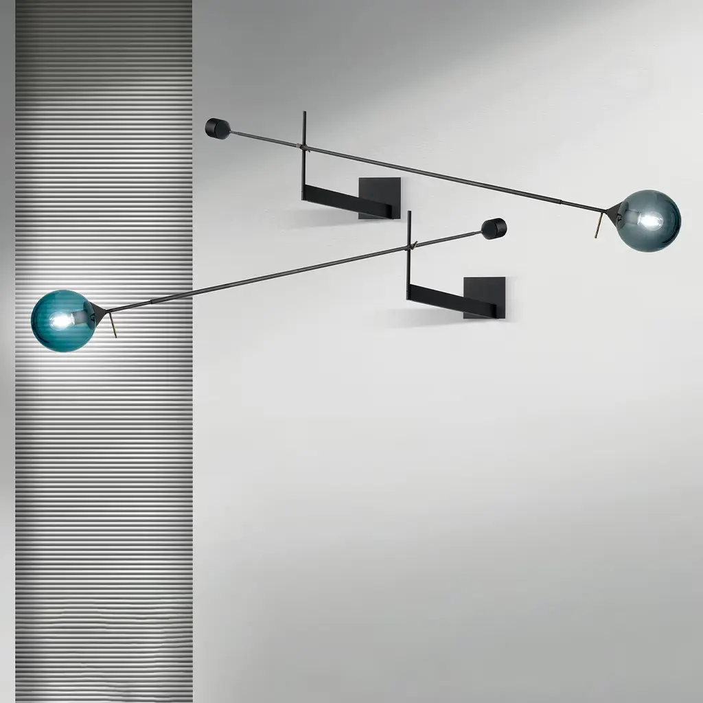 A unique design from a series of lighting fixtures available with four, eight, 12, or even a single light, this wall lamp will imbue a contemporary interior with timeless sophistication. Made of burnished metal, it features a mouth-blown Murano glass shade showcasing a petrol blue shade, also available in bronze, amethyst, gray, and steel. It supports an E26 LED bulb. Please consult the Artemest catalog for other available designs.
