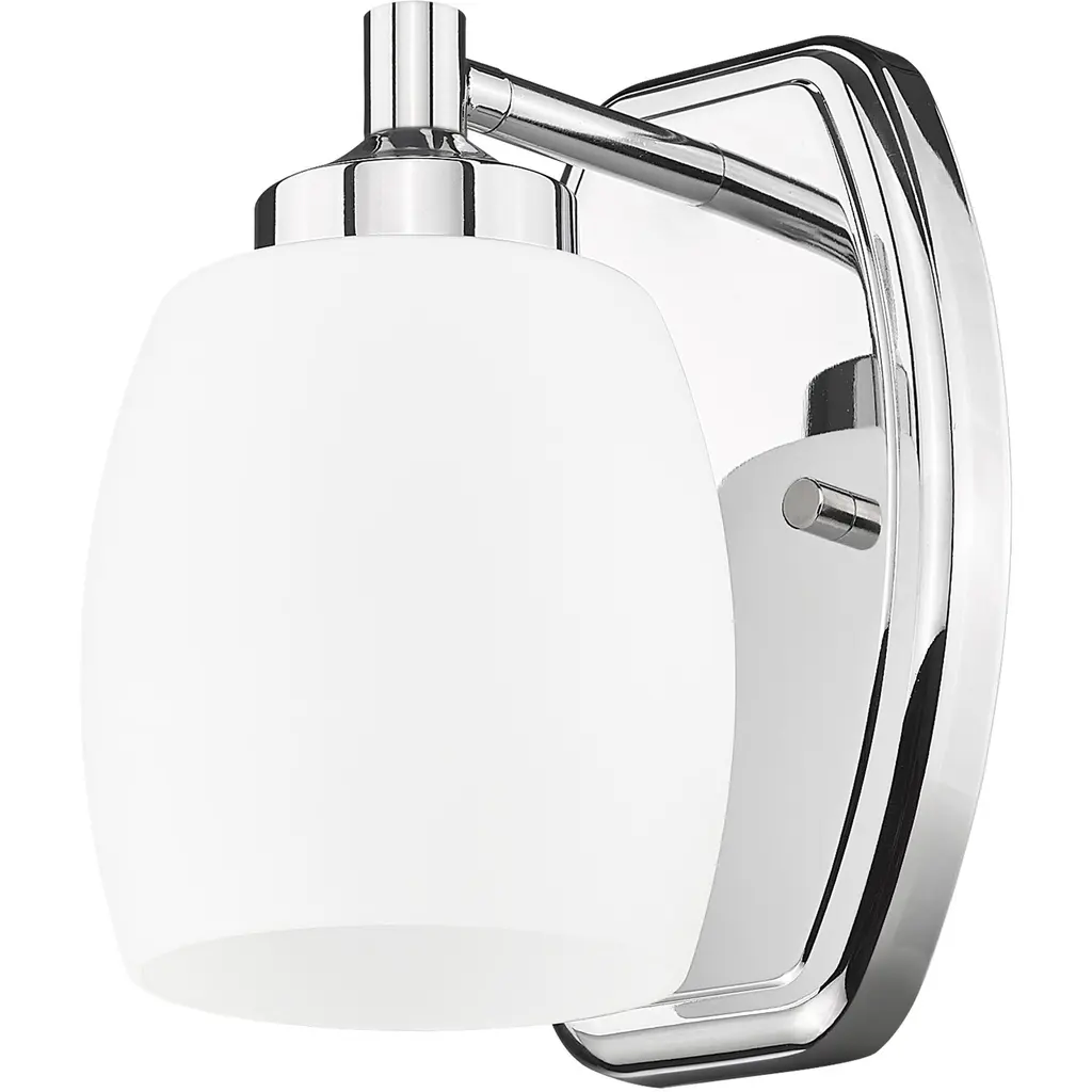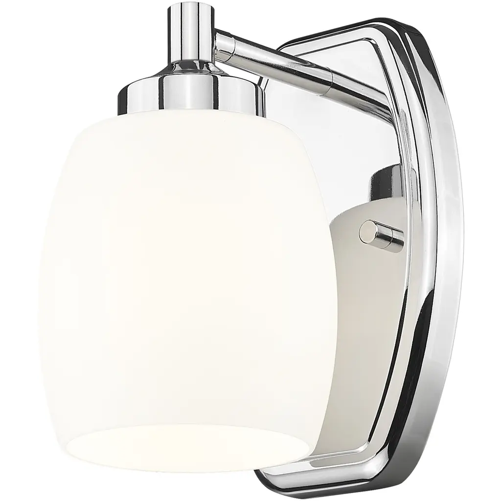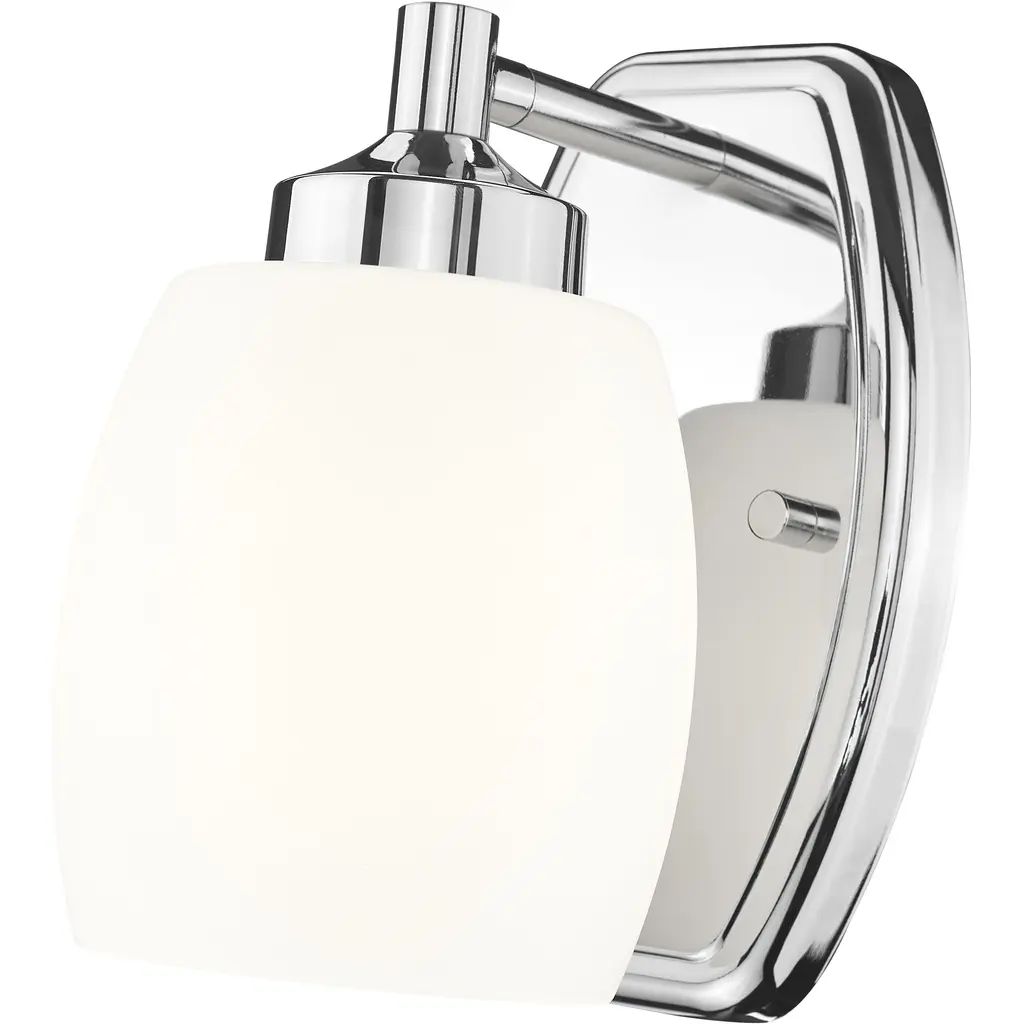 The soothing simplicity of matte opal glass contrasts beautifully with the gleaming chrome finish of a modern one-light wall sconce. Beautiful in a bath or living area, it showcases simple, smooth curves in both its wall plate and shade.